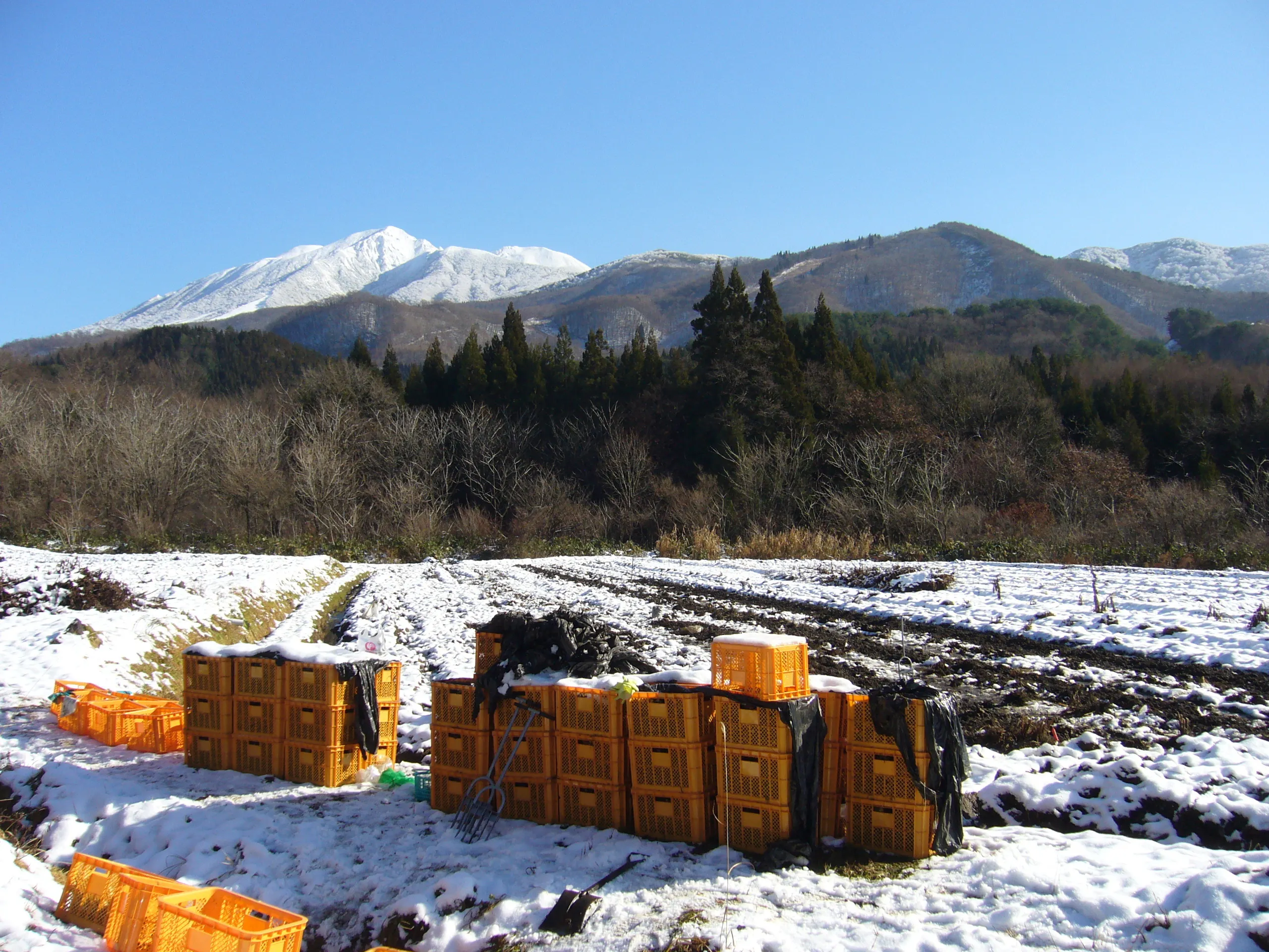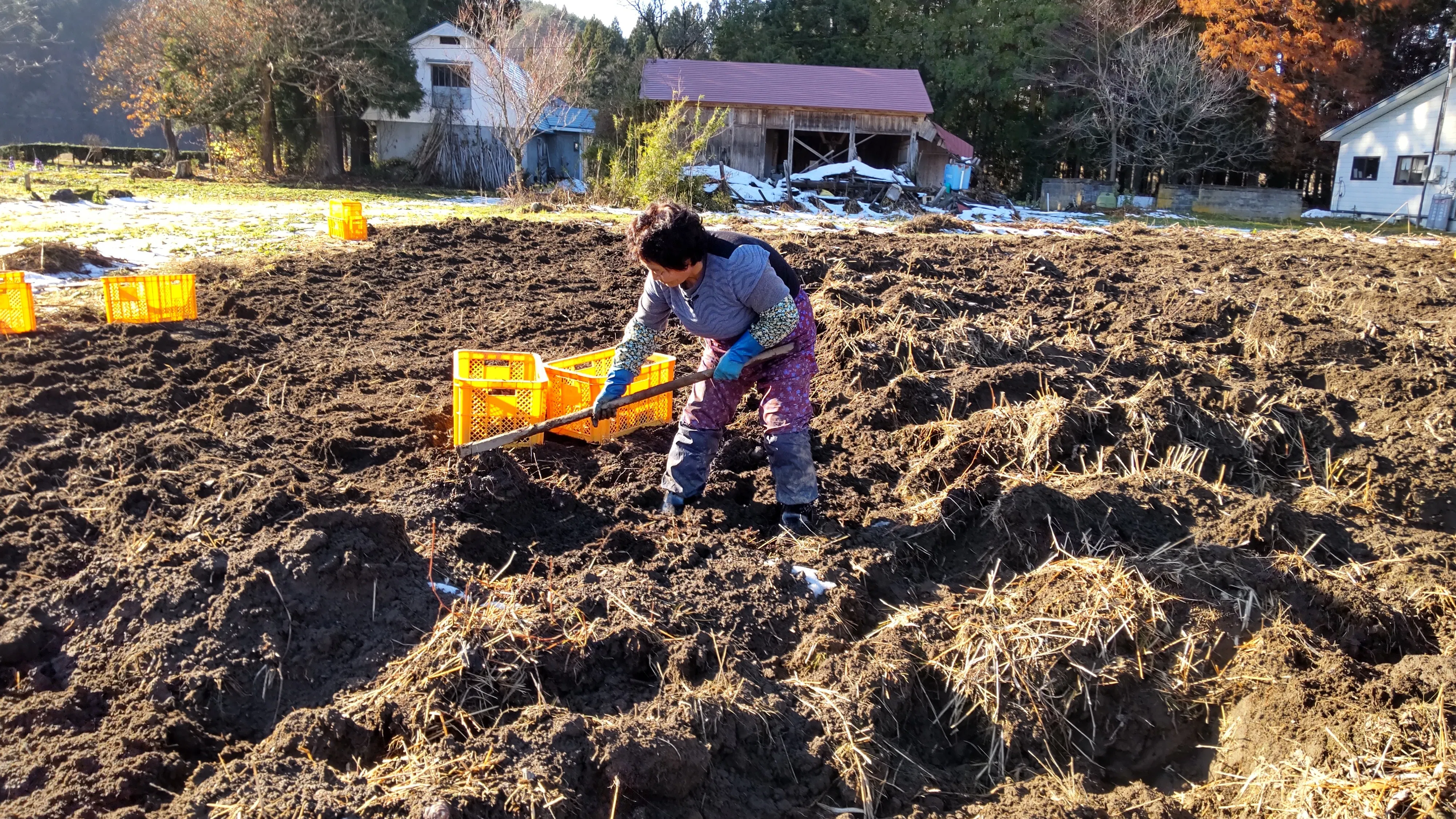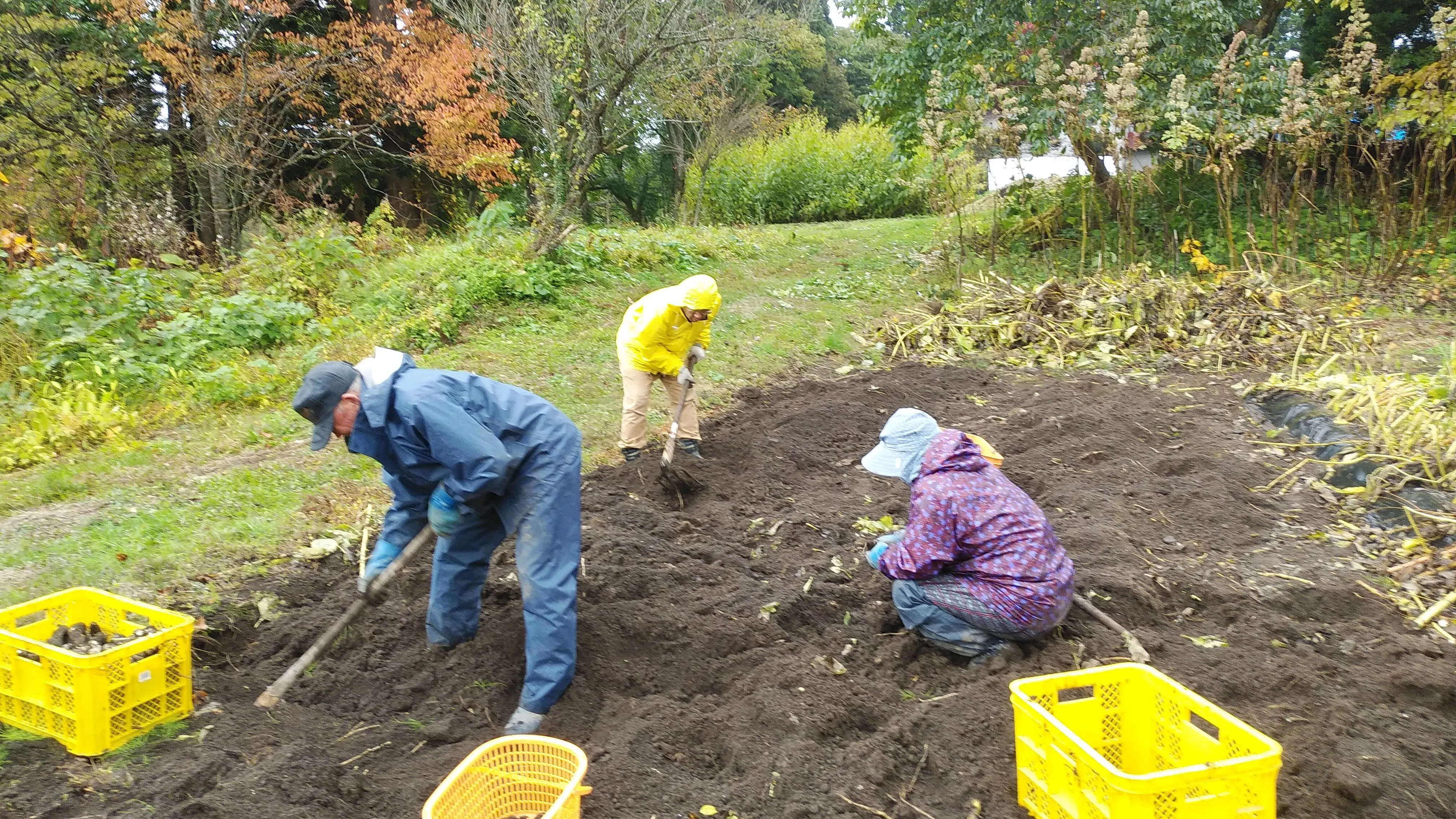 その後、畑(下の写真)の場所を変え、4反歩(約1200坪)までに減らしましたが、全面手掘りでの収穫は大変な作業。頼みの綱だった男性も体調を崩し休業、掘りても見つからず、ここ4年は私を含め女性(平均年齢約74歳)4人で収穫しております。