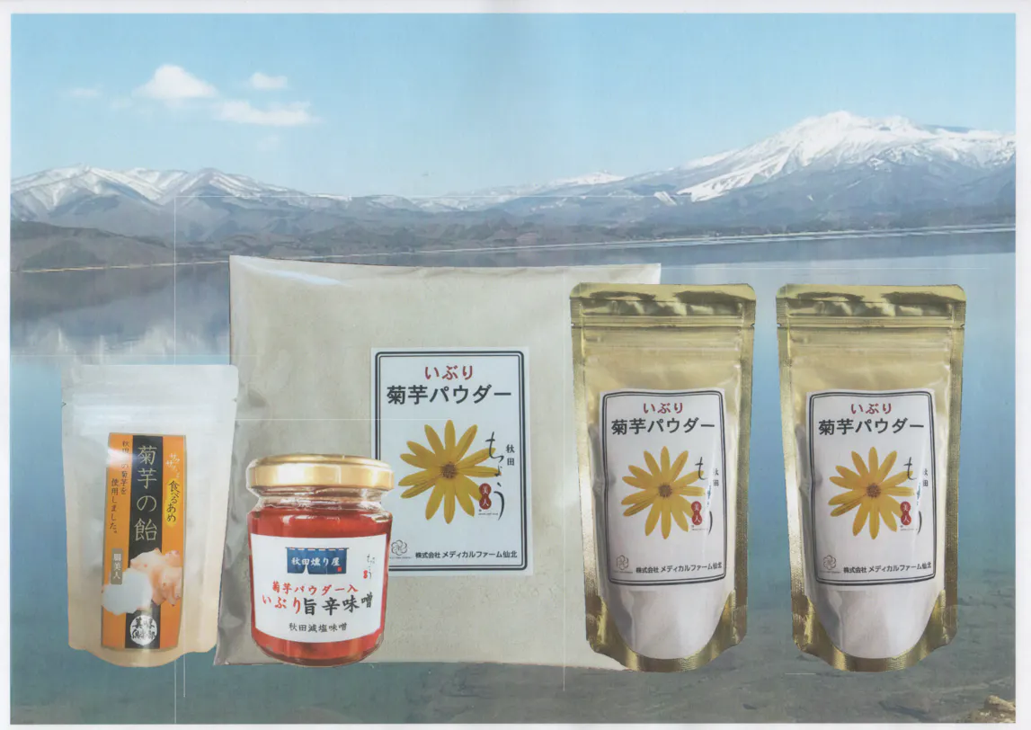 弊社商品「イブリ菊芋(商標登録済み:前出)パウダー」は、自社ブランド「秋田ちょう美人(商標登録済み:前出)」のオリジナル製品です。いぶりは「いぶりがっこ」に代表されるように、保存技術として古くから秋田の食文化に根付いています。