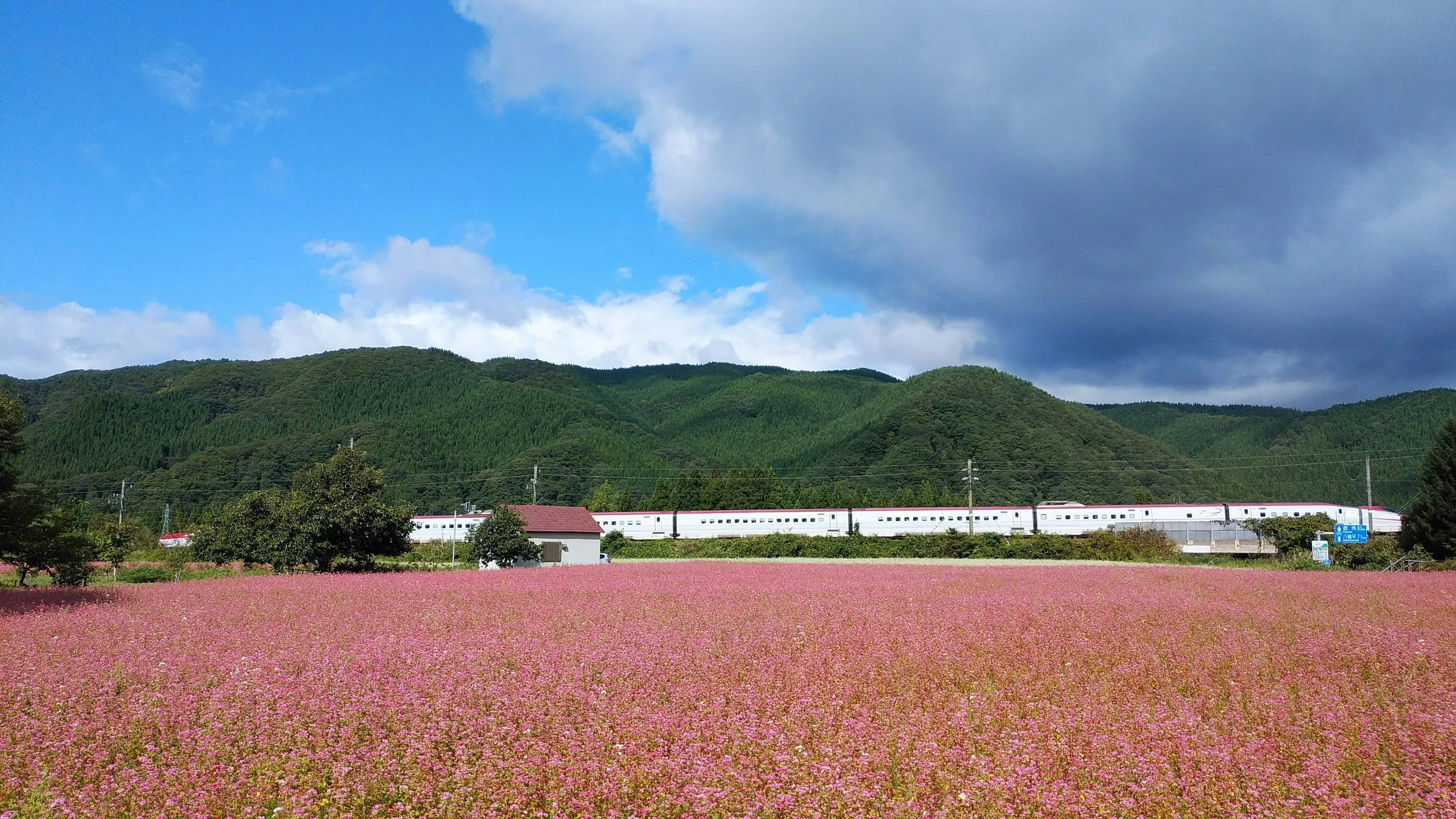≪赤そば畑の側を走る新幹線あきたこまち≫