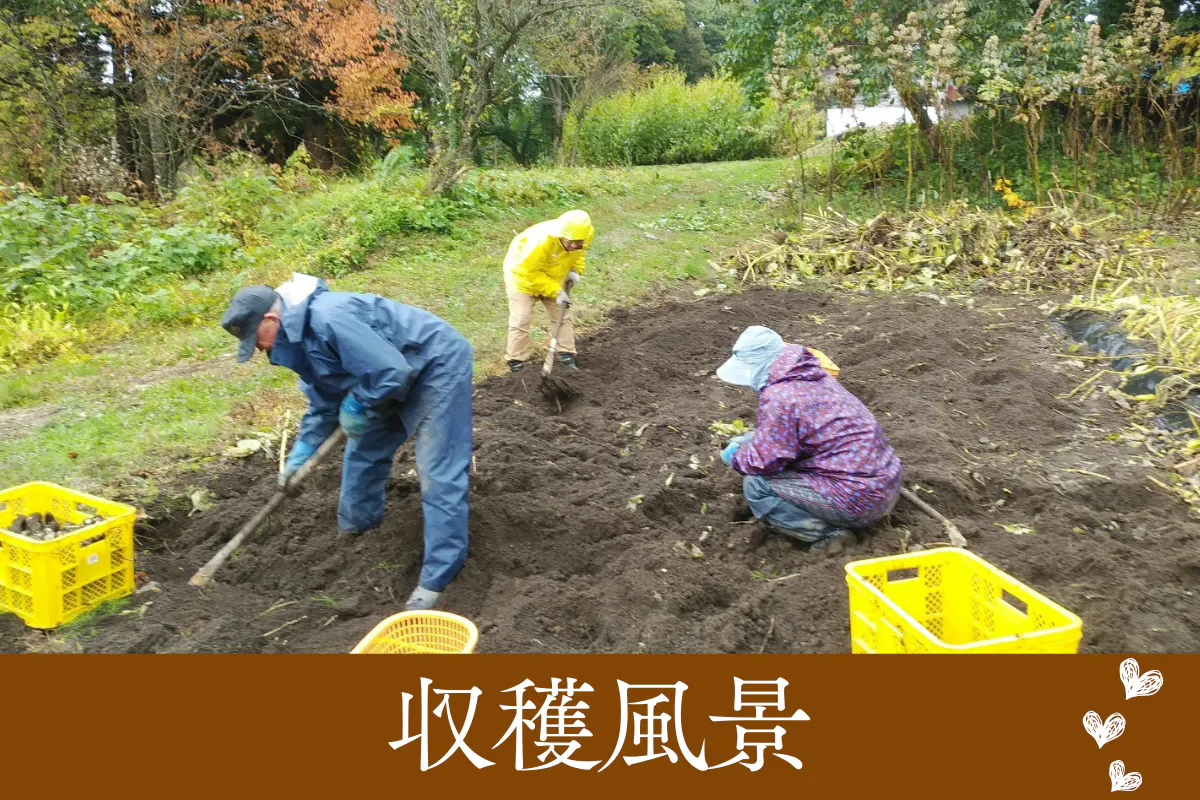 一筋縄ではいかない収穫作業1㎝ほどの菊芋でも飛んだ先で芽を出し、畝以外にも雑草のように広がります。横だけでなくかなり地下深く(50㎝以上)にも根を張るため、ジャガイモ堀り機では20~30㎝しか掘る事ができません。また、ぬかった畑では機械が使えず、畑の隅から隅まで全面を手掘りしてきました。