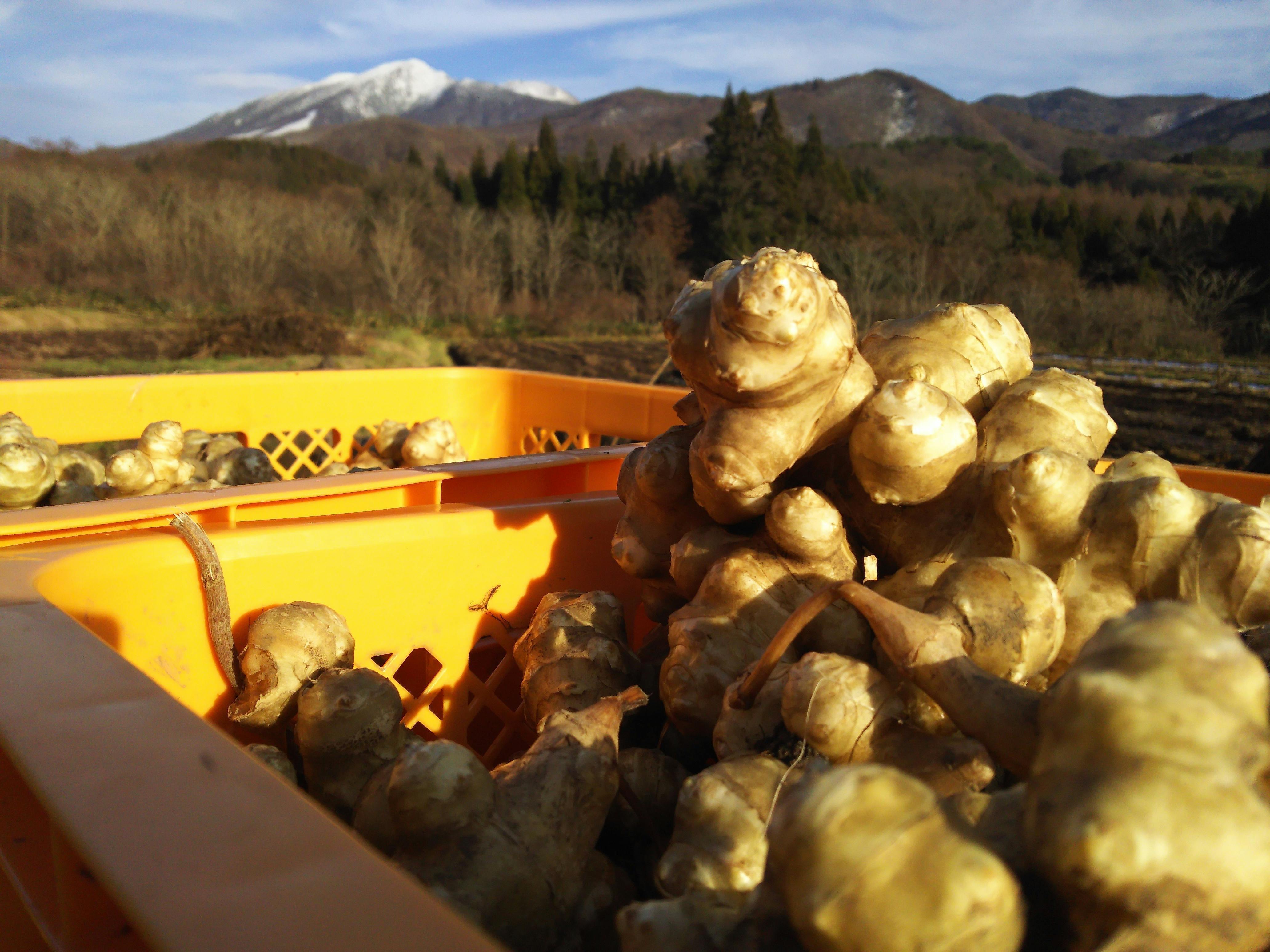 一筋縄ではいかない収穫作業1㎝ほどの菊芋でも飛んだ先で芽を出し、畝以外にも雑草のように広がります。横だけでなくかなり地下深く(50㎝以上)にも根を張るため、ジャガイモ堀り機では20~30㎝しか掘る事ができません。また、ぬかった畑では機械が使えず、畑の隅から隅まで全面を手掘りしてきました。