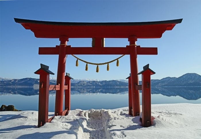 ≪田沢湖側に建つ御座の石神社の鳥居≫