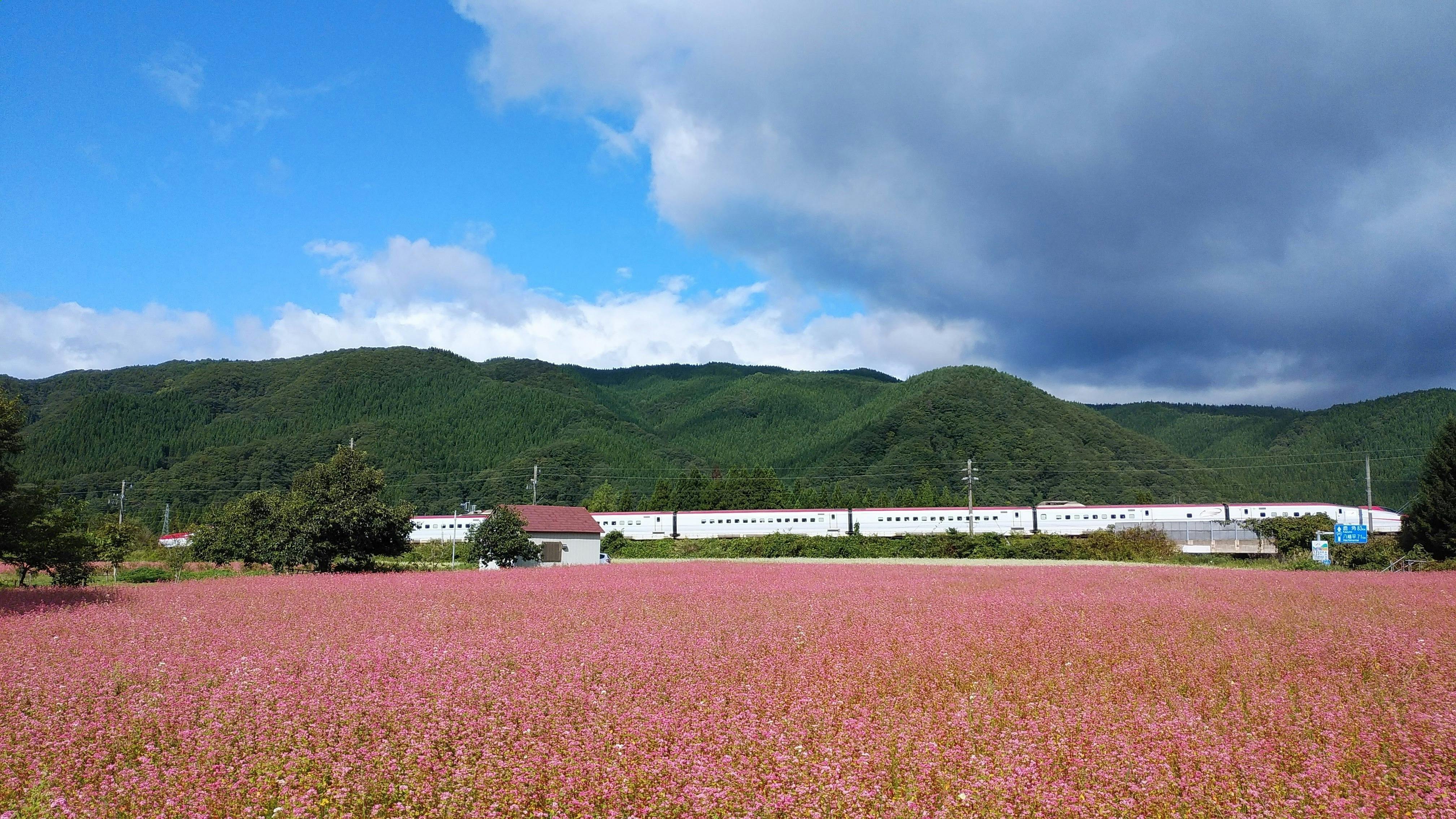 ≪赤そば畑の側を走る新幹線あきたこまち≫