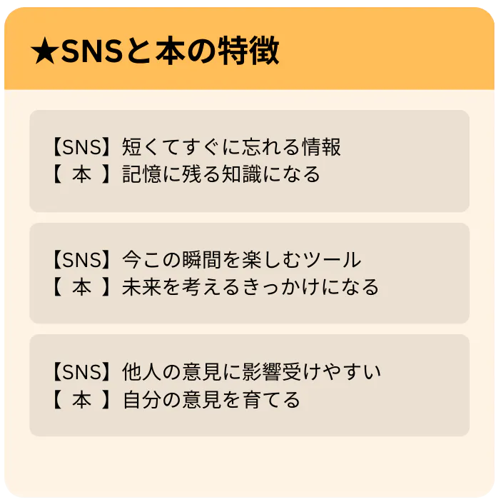 SNSは即座に答えをくれるかもしれませんが、本は 「問いをくれる」 メディアです。本を読むことで、子どもは 自分で考え、理解し、答えを見つける力 を養うことができます。