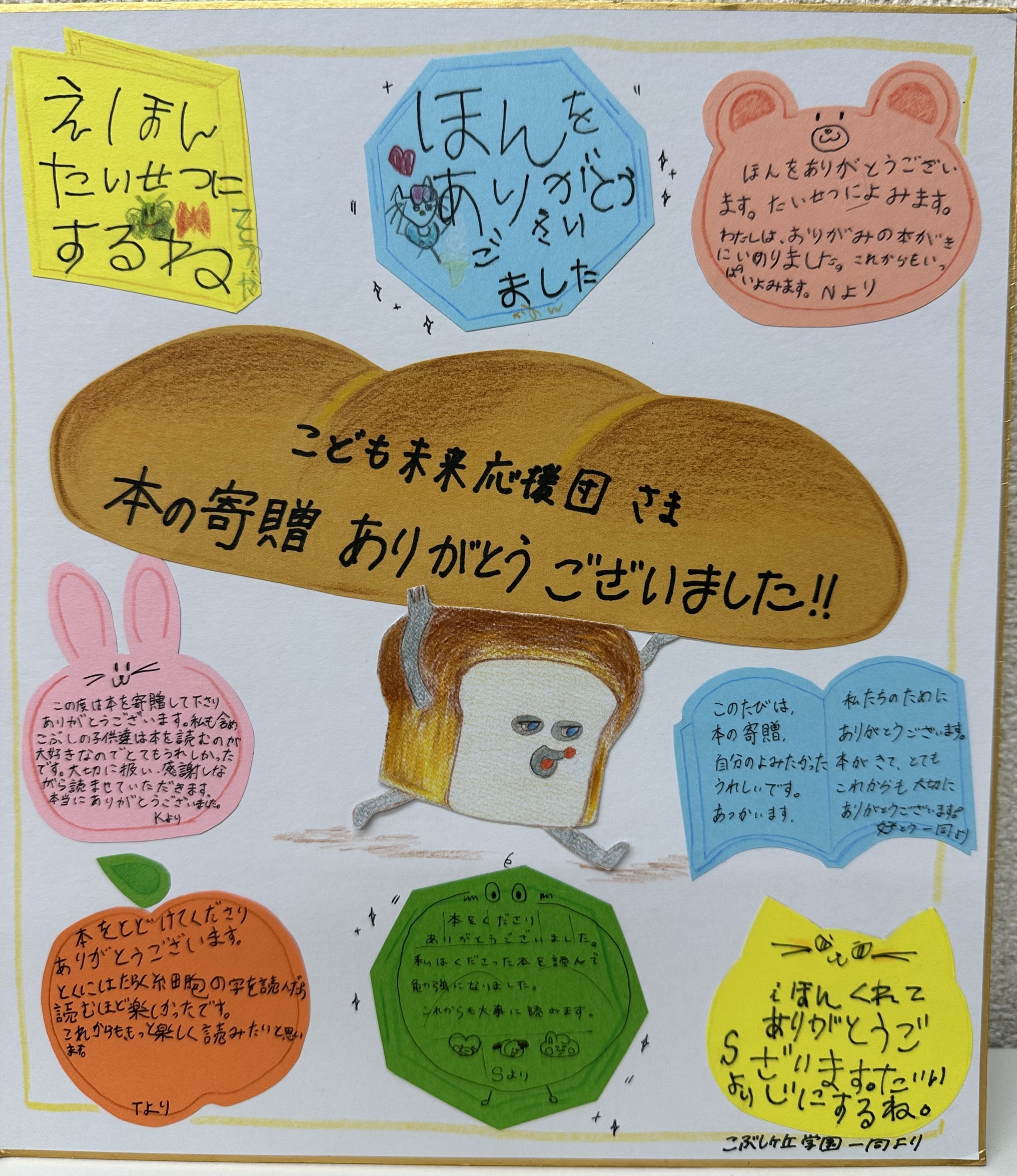 こども未来応援団です。先日、広島県「こぶしヶ丘学園」様の活動報告をさせていただきましたが、後日、 子どもたちや職員様から心のこもった嬉しい寄せ書きをいただきました!「本をありがとうございます」「絵本を大切にします」「たくさん読んで、自分の力にしたいです」寄せ書きには、一人ひとりの素直で前向きな想いが詰まっており、私たちの活動の意味をあらためて感じさせてくれるものでした。子どもたちが本を通じて新たな世界に触れ、心を育んでいけるよう、私たちも引き続き支援を続けてまいります。このように直接声を届けていただけることは、支援をする側にとっても大きな励みになります。今後も、つながりを大切にした支援を広げていきたいと思います。こども未来応援団 近江谷広樹