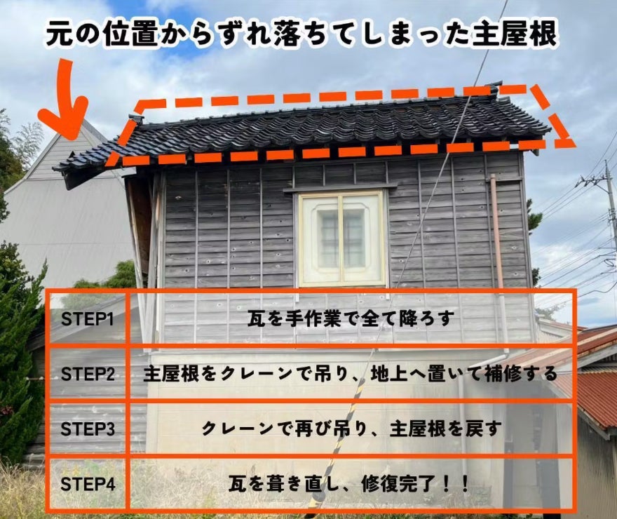 このように、大きく4段階のプロセスがあり、私たち建築の素人では到底直すことができず、①と②の屋根を直すのに、きちんと職人さんたちに施工をお願いするための費用が、300万円必要なのですー!!