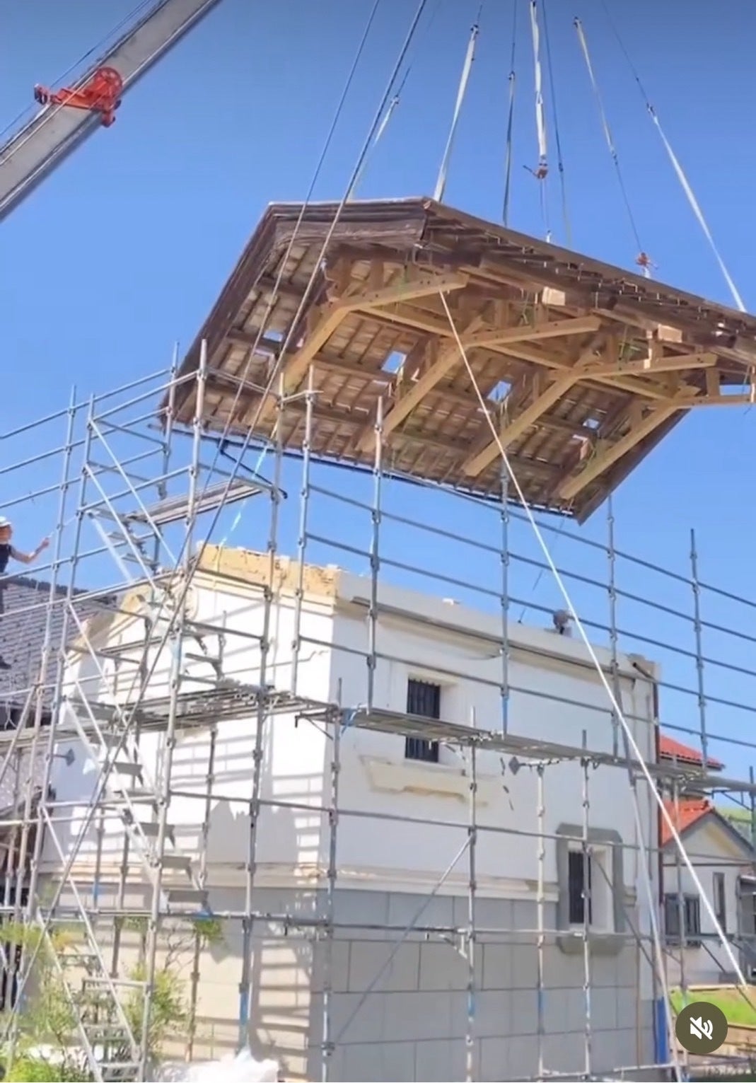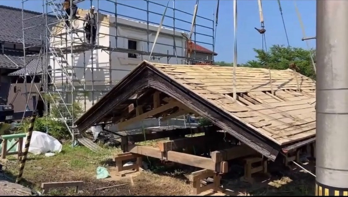 地面に置いた屋根で傷んだ箇所を修理して、また再びクレーンで吊り、屋根を元の正しい位置に設置します。
