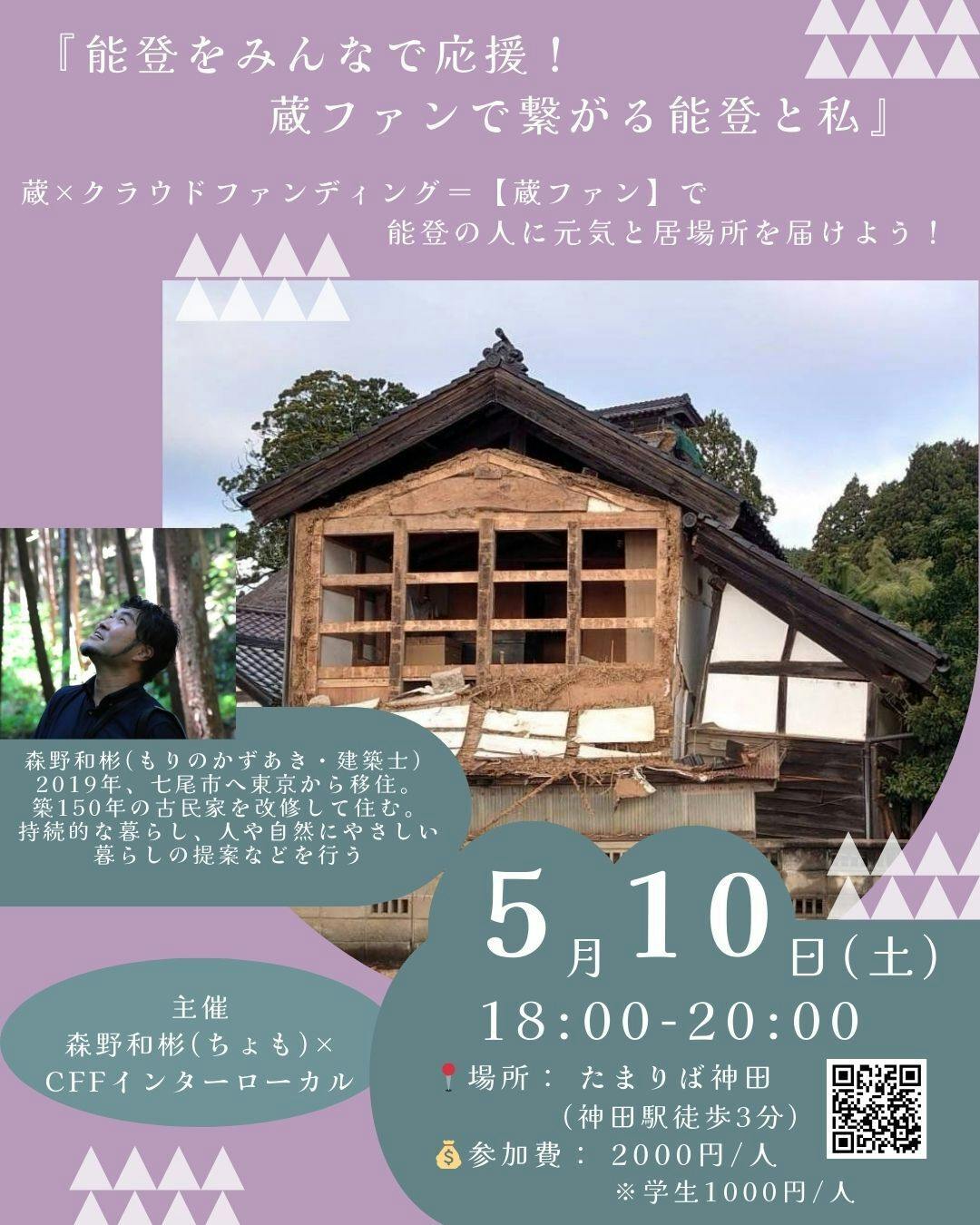 こんにちは!森野さんと一緒にこのプロジェクトを運営しているCFFインターローカルです。たくさんのご支援、本当にありがとうございます!私たち「CFFインターローカル」は、海外ボランティアが主な事業である認定NPO法人CFFジャパンの国内活動チームのひとつです。現在は、森野さんのご自宅を拠点に、能登地域で災害ボランティア活動を続けています。私たちからお知らせです!5月10日(土)に、オフラインイベントを開催します。このイベントでは、私たちの活動紹介や、現地のリアルな声をお届けし、みなさんと一緒に能登の未来について考える時間をつくります!「能登の今が気になる」「みんなと能登について語り合いたい」「地域や被災地のことを一緒に考える仲間がほしい」そんな方にぴったりの会です!ご友人やご家族をお誘い合わせのうえ、ぜひお気軽にご参加ください!『能登をみんなで応援!蔵ファンで繋がる能登と私』【日程】5月10日(土) 18:00〜20:00ごろ〈申し込み締切: 5月8日(木)まで〉【場所】たまりば神田(東京都千代田区神田多町2丁目2-9 マガザン神田Ⅲ 4階)JR神田駅より徒歩3分会場はこちら → https://maps.app.goo.gl/NQ2RsojR1ioHoVyT7【参加費】2,000円/人(学生は 1,000円/人)【ご参加方法】下記のフォームより事前にお申し込みをお願いします!https://forms.gle/TpBNf9aMmra7KESb7【当日の流れ】①インターローカルの活動紹介と能登のいま(現地の様子をリアルにお届け!)②蔵ファンのご紹介(地元の人たちの声を届けます!)③グループシェアタイム(みんなで能登に心を寄せよう)④交流フリータイム(軽食あり!ワイワイ交流しましょう)*私たちの活動はInstagramで発信しています。ぜひフォローしていただけたらうれしいです!CFFジャパン・インターローカル Instagramアカウント⇩https://www.instagram.com/cffjapan_interlocal/
