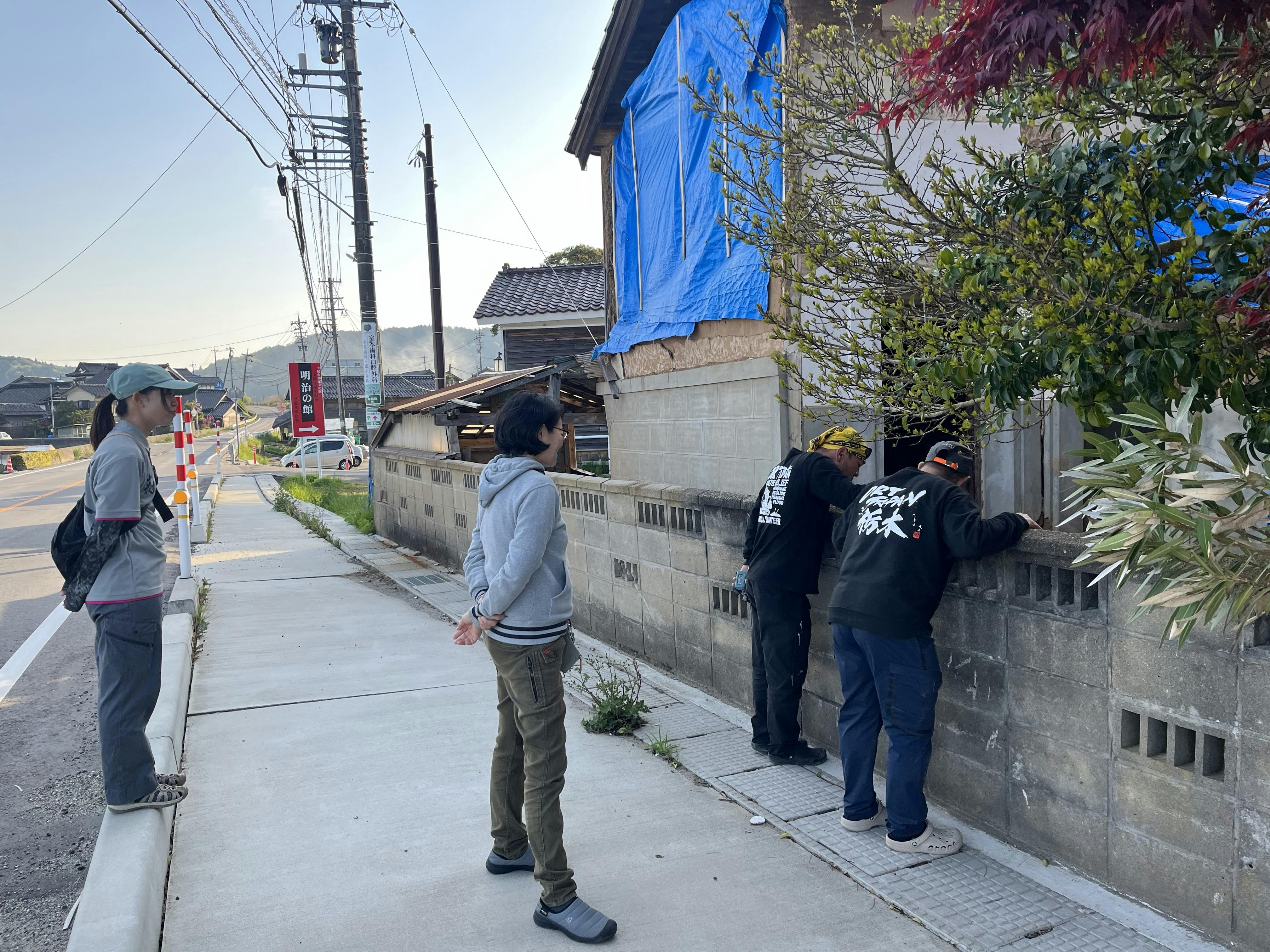 【蔵の再生へ向けて、DIYでの解体作業を開始します!!】世の中はGWに突入。本日から、CFFインターローカルのメンバーも現地にて活動します!基本的には地域のニーズに合わせて、今回は中島町で有志の実行委員会により開催されるイベントのお手伝いを行う予定です。ですが、少しずつでも『蔵→居場所』への再生も進めていきたい。と考えて、構想の第一歩となる、アプローチの変更。地域の方々が気軽に、直接出入りが出来るように新たな出入りルートをつくるために、地震でこれも若干傾いていたブロック塀の解体に着手します!!(※写真は、素人でも解体できるように、事前にブロック塀をカットしたり、危険を伴う作業をやって頂ける技術系ボランティアDRT JAPANの方が現場確認に来てくださった様子です!)また、作業の進捗もご報告していきます!