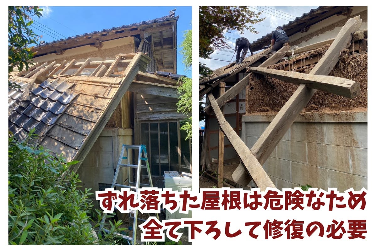 しかし、蔵の一番大きな屋根はズレ落ちています。修復するには、屋根を地上に丸ごと降ろす必要があり、再生への道のりは簡単ではありません。