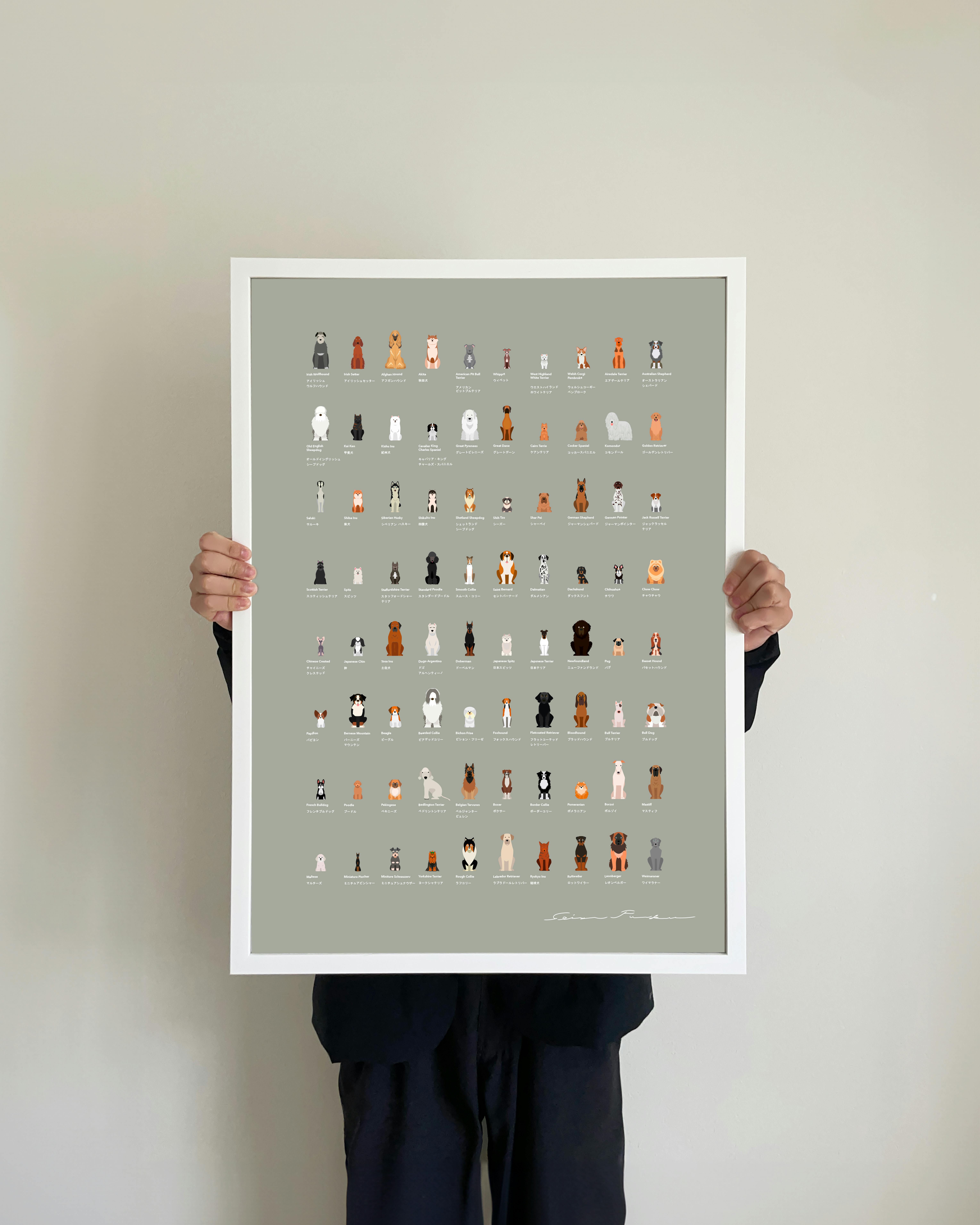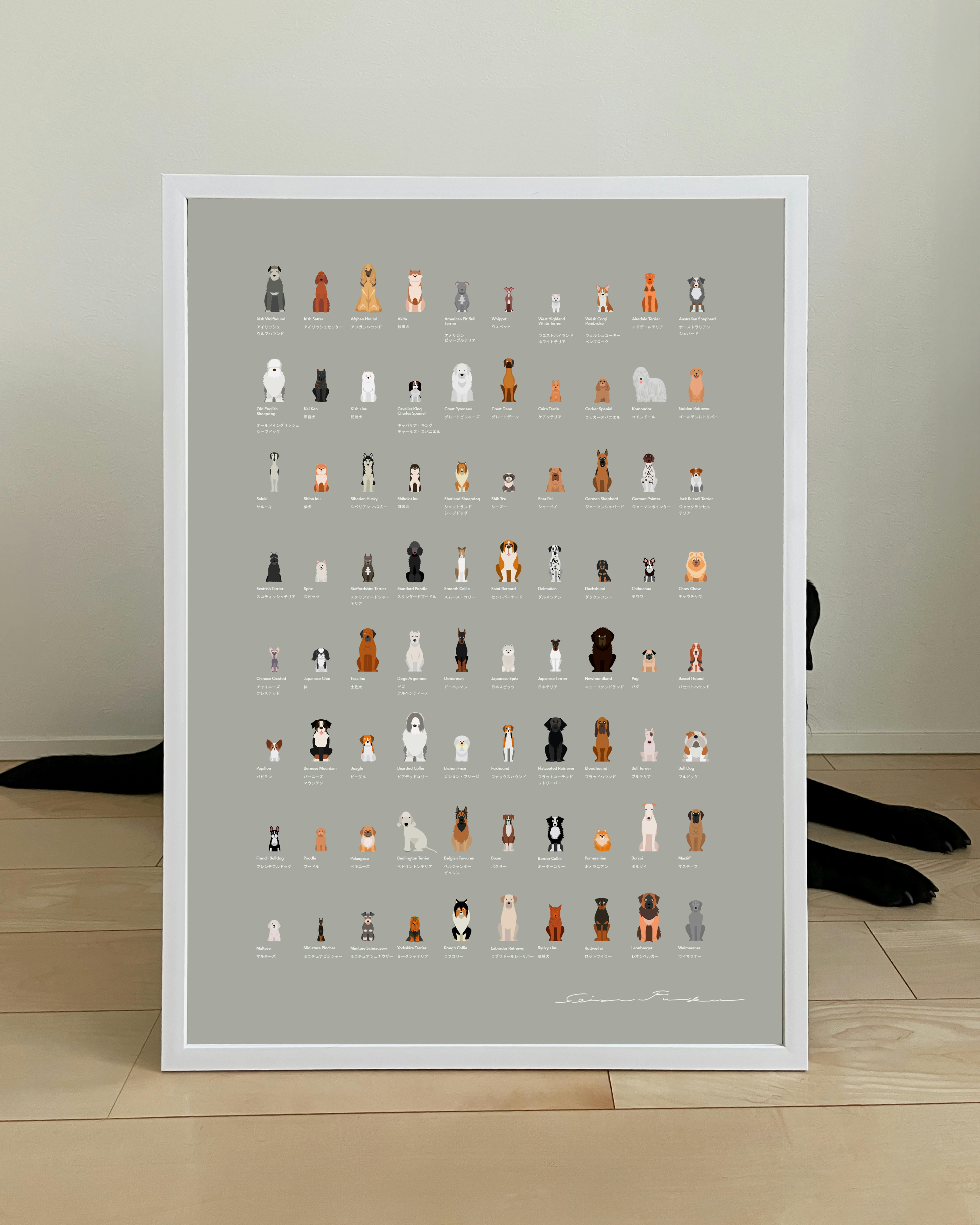 このポスターは、世界中の80種類の犬種をデザインしたアート作品です。