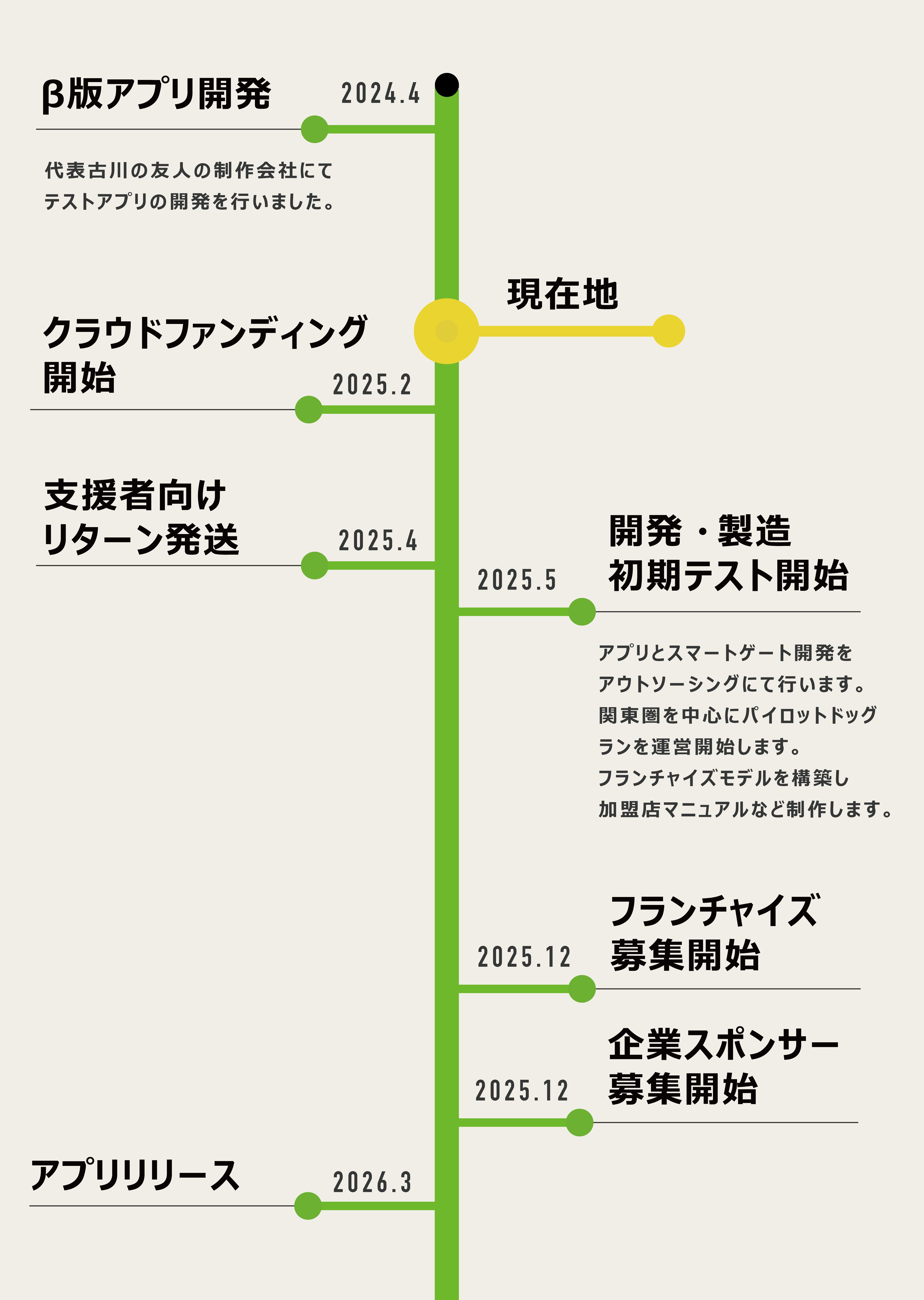下の表は現時点において事業計画通りに進展した場合のスケジュールです。そのため、今回の調達金額によって、スケジュールは変更となる場合がございますので、予めご了承ください。
