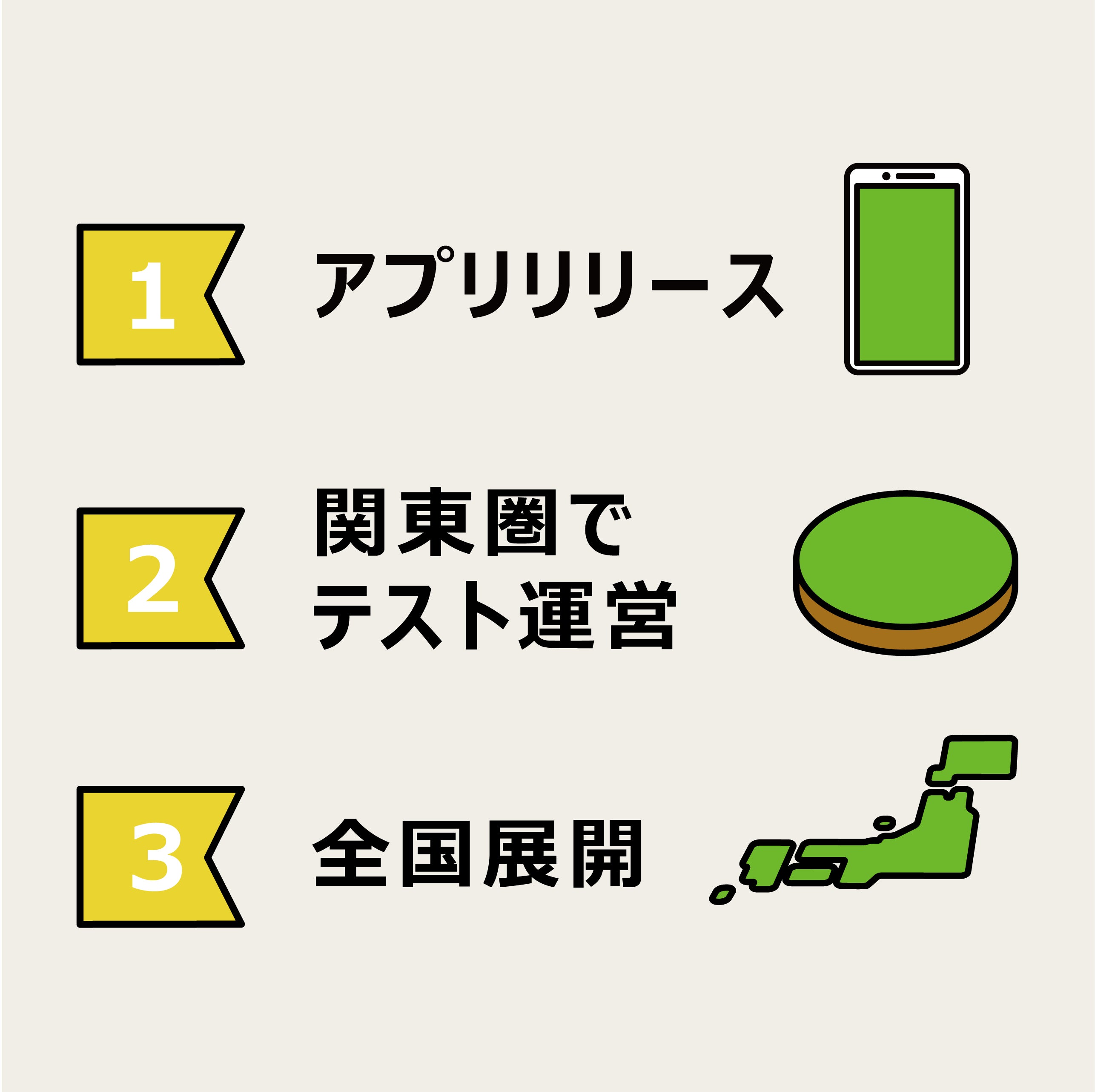 これらのエリアでの運営データを基に、フランチャイズオーナーさまや提携パートナーを募り、首都圏・関西圏・中部圏など都市部への展開を目指します。