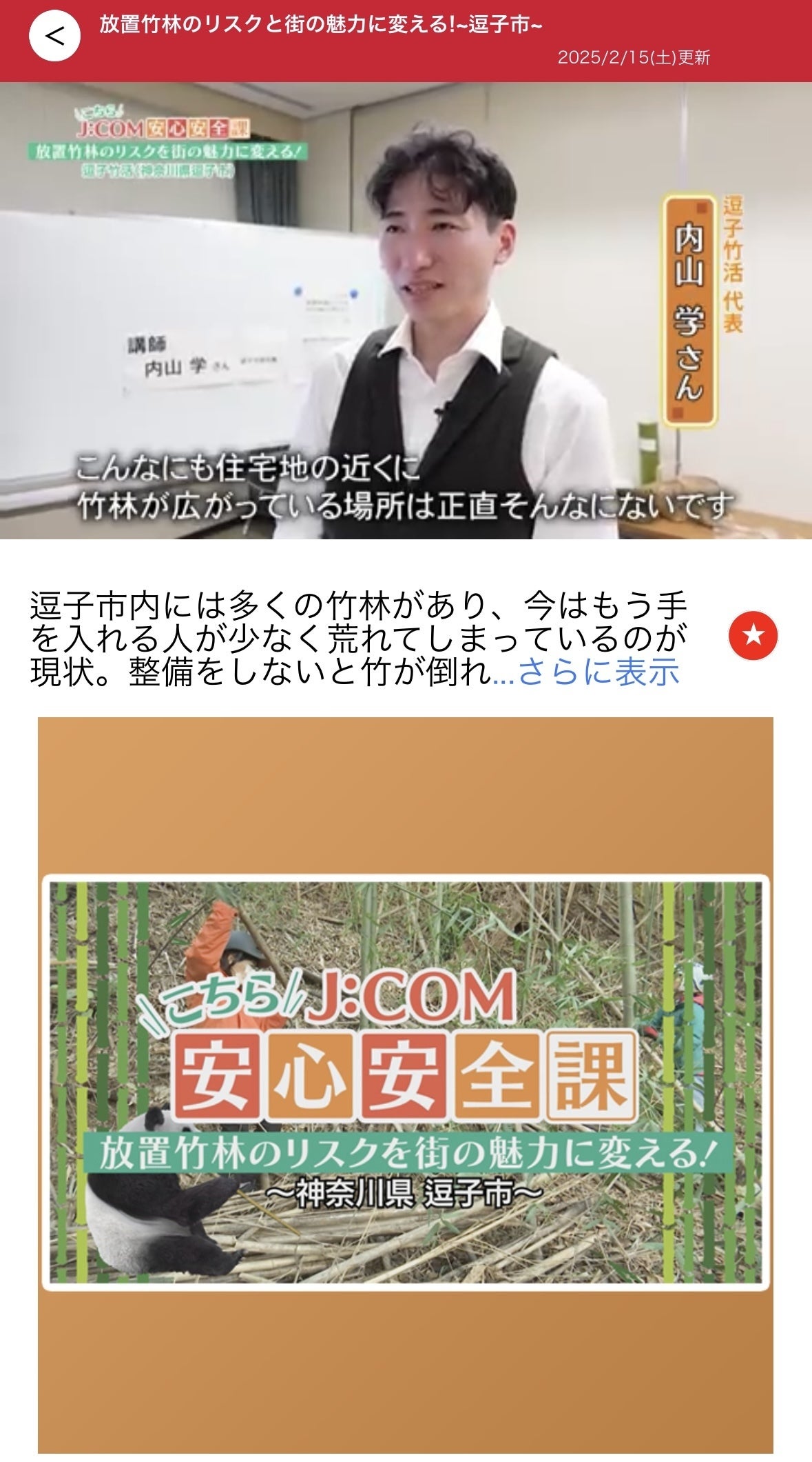 昨年のNHKに続き、J:COMチャンネルにて逗子竹活が放送中!『こちらJ:COM安心安全課』2月15日(土)、16日(日)11:30〜2月17日(月)〜(金)15:00〜またはスマホアプリ「どろーかる」か、下記のYouTubeチャンネルでも視聴可能です。YouTubeチャンネル3分番組なので、いろいろ端折っている説明もありますが、ディレクターさんと話し合い、分かりやすさを最優先とし、何度も取材を重ね、熱心にメールや電話で質問もいただきました。番組自体は防災をテーマにJ:COMが使命感を持って作っている非常に硬派な内容で、少しでもとっつきやすい雰囲気にしていると感じました。是非ご覧いただき、防災面を重視する逗子竹活の活動を応援よろしくお願いします。ネクストゴールまで残り12人となりました!ありがとうございます!