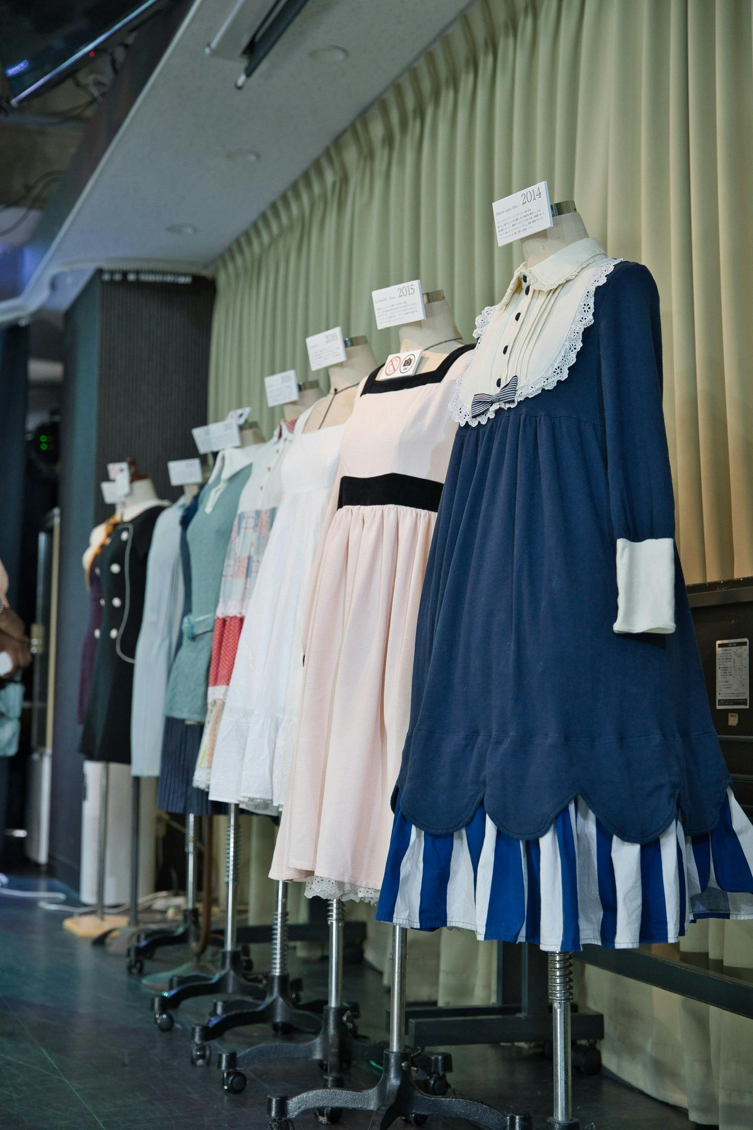 ブランド創業当初は、ロリータスタイルのお店でした。開店から2年後に現在のスタイルへ方向転換し、これまで多くのお客様に親しまれてまいりました。お写真は、10周年記念イベントの際に歴代の製品を展示させていただきました。手前側が初期のお洋服で、奥に行くにつれて現在のスタイルへと変化しております。