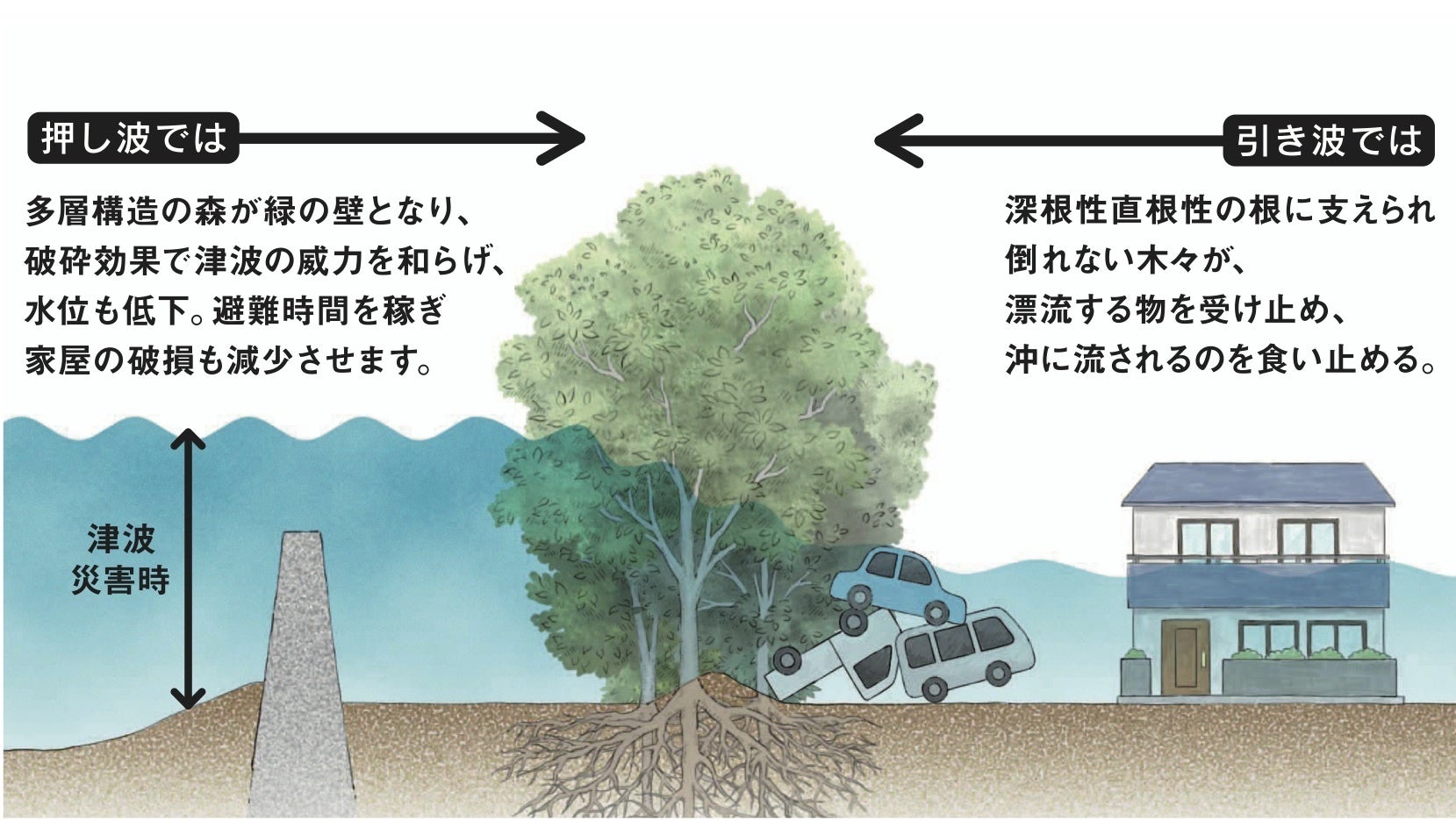 例えば、地震による津波からいのちを守るための森は、深く根を張ることで津波の勢いにも耐え、「緑の盾」として津波を弱める役割を果たします。また、引き波では漂流物を受け止め、沖への流出を防ぐ効果もあります。さらに、人工物と異なり、この森は自然の力で天然更新し、長期的にその機能を維持します。