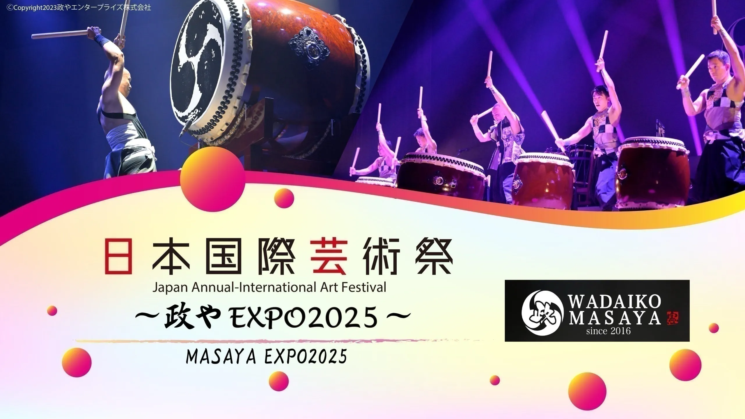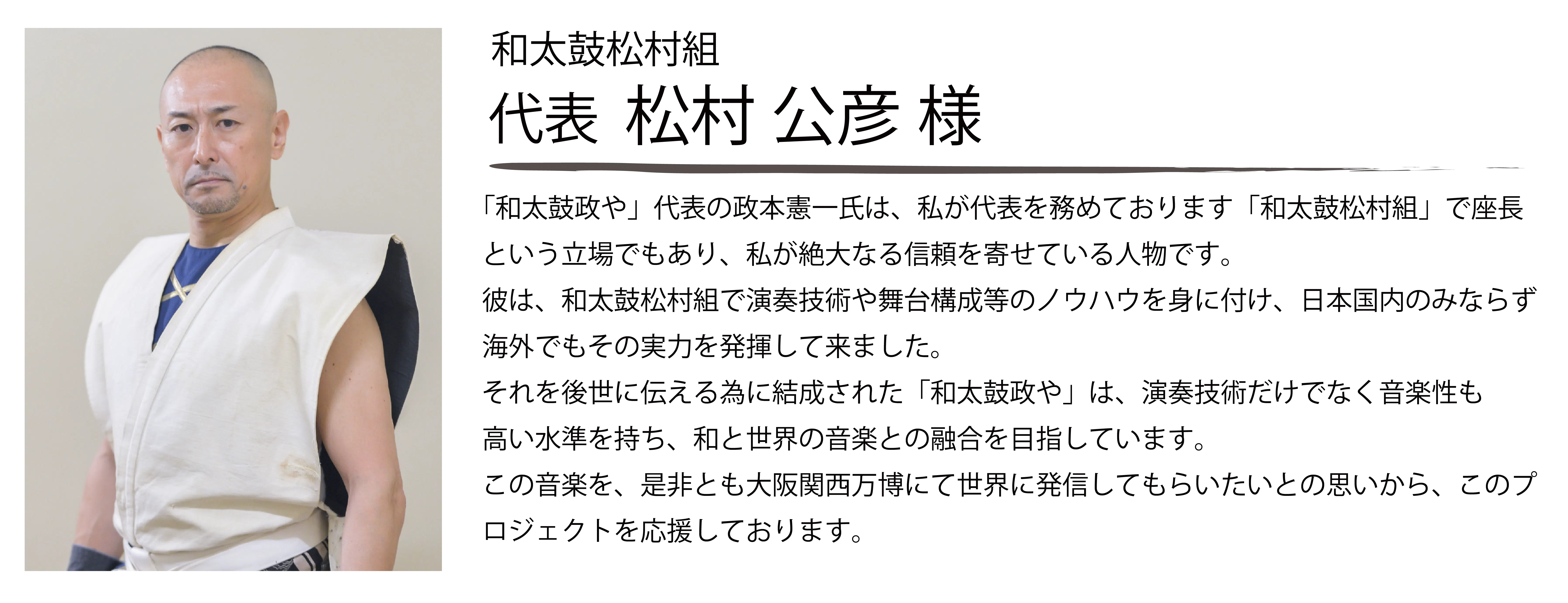 また、和太鼓ワークショップを開催し、和太鼓体験を通じ更にその魅力を感じてもらうと同時に、最終的には公演のフィナーレにて共に演奏を行い「政やEXPO2025」会場が一体となる舞台空間を目指します。