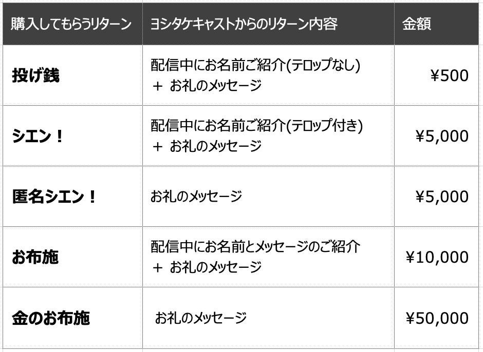 購入のリターン:配信中にお名前ご紹介(テロップなし) + お礼のメッセージ
