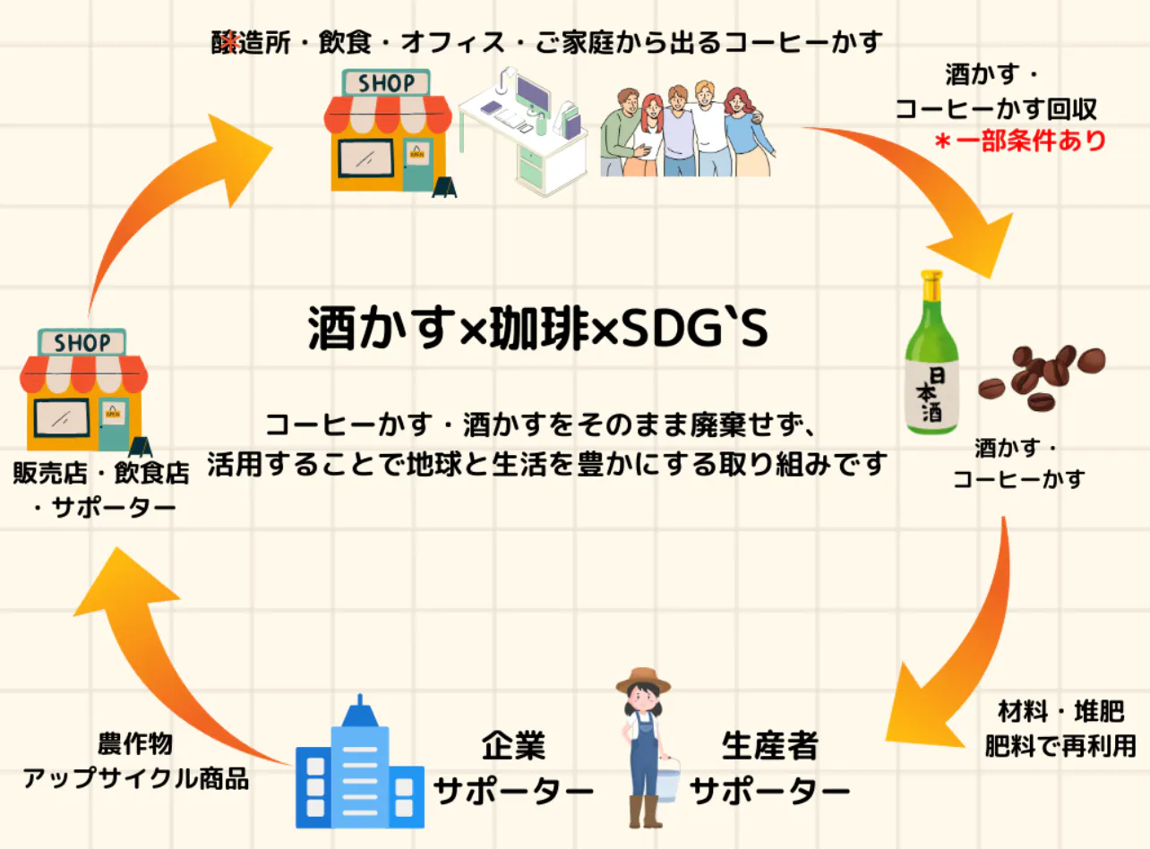 日本酒製造で出てくる酒粕、ドリップコーヒーで出てくるコーヒーかす、酒蔵や飲食店のご協力を頂き、廃棄される酒粕やコーヒーかすを回収し、栽培で活用していただける農業生産者、個人で使っていただける方に#freecoffeegroundsとして提供しています。