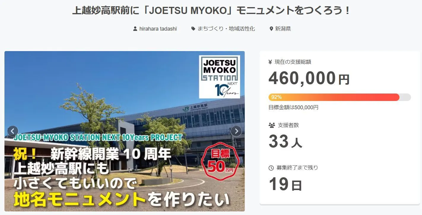 このクラウドファンディングはモニュメントを作りたい!ということだけではなく、皆さんのお気持ちやお名前を10周年を迎えた上越妙高駅前に残すという試みでもあると考えています。