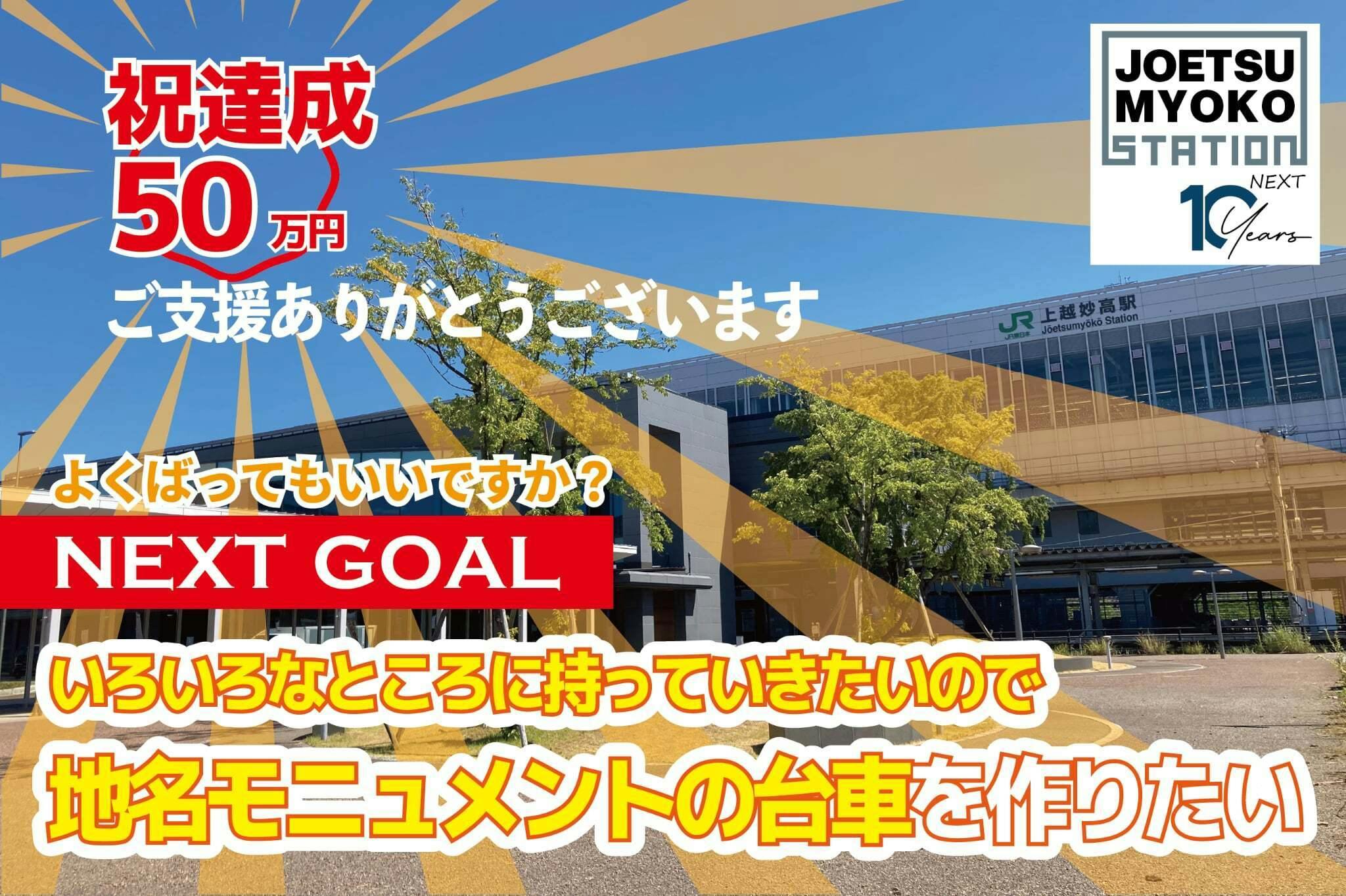 クラウドファンディング達成のご報告と御礼おかげさまで、本プロジェクトは目標金額を達成することができました。ご支援いただいた皆さまに、心より御礼申し上げます。上越妙高駅の開業10周年という特別な節目に、このプロジェクトにご参加いただけたことが、皆さまにとっても思い出深いものとなれば幸いです。さらに、ネクストゴールとして掲げていた「モニュメントを移動可能にするための台車の作成」に向けて、約15万円の追加支援をいただきました。これにより、イベント時には駅前広場や各会場などへスムーズにモニュメントを移動・設置でき、より多くの方々に記念撮影を楽しんでいただけるようになります。完成は5月を予定しており、お披露目も同月中を目指しています。形になる日を、どうぞ楽しみにお待ちください。なお、上越妙高駅西口のコンテナ商店街フルサットでは6月に施設開業9周年イベントを予定しています。今後とも、変わらぬご支援・ご関心を賜りますようお願い申し上げます。上越妙高駅ネクスト10コンソーシアム 事務局 平原