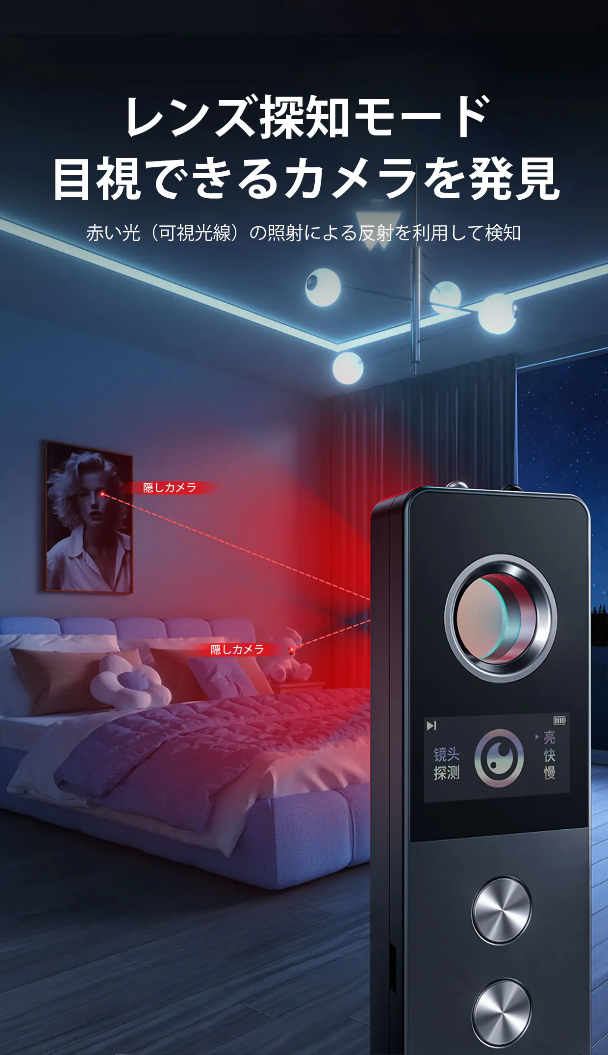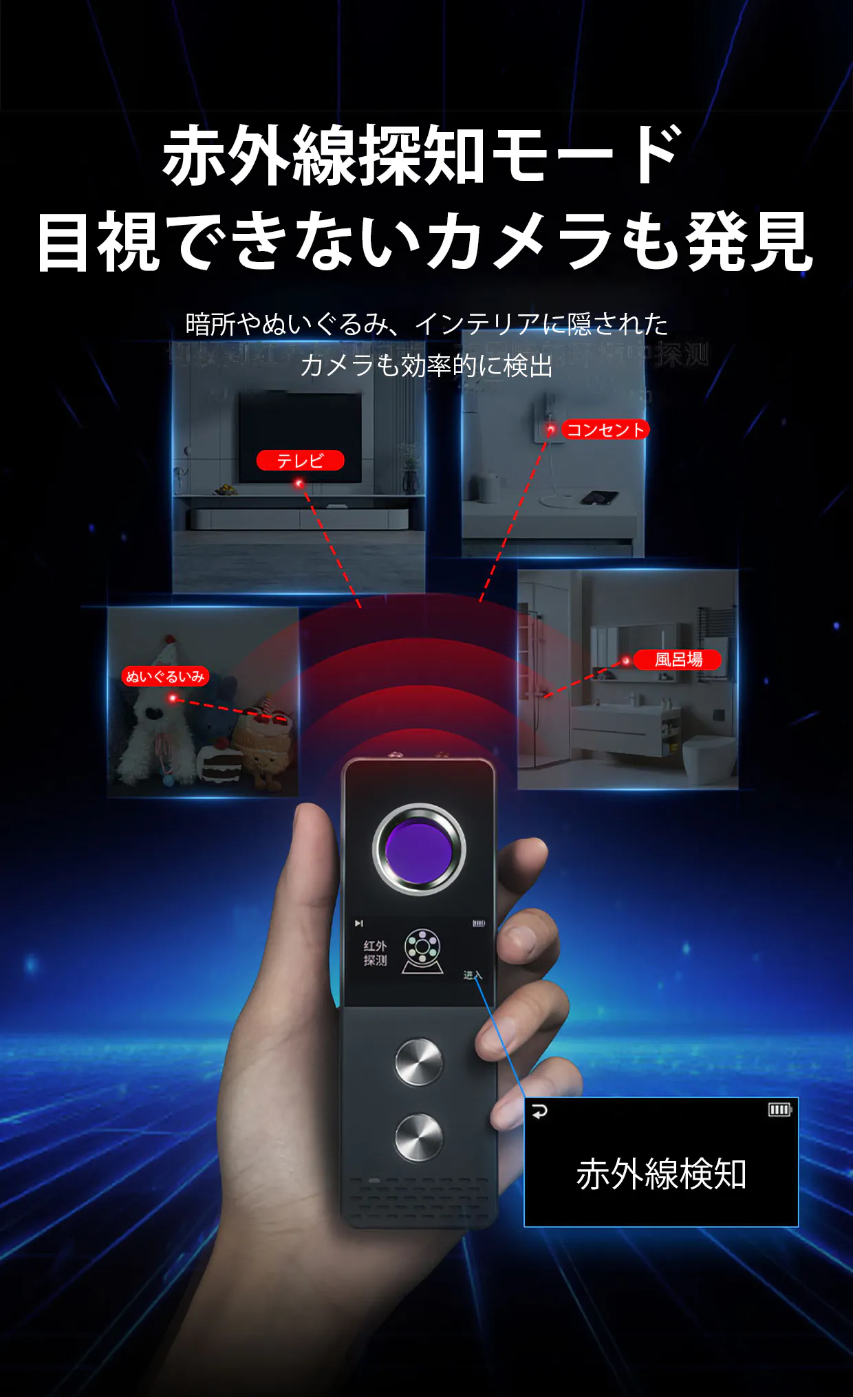 本製品は暗視機能付きカメラが発する赤外線を検知し、暗所やぬいぐるみ、インテリアに隠されたカメラも効果的に見つけ出します。