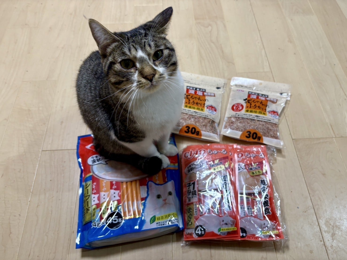 みんなの大好きなチュールとカリカリにトッピングできるかつお節など頂きました。