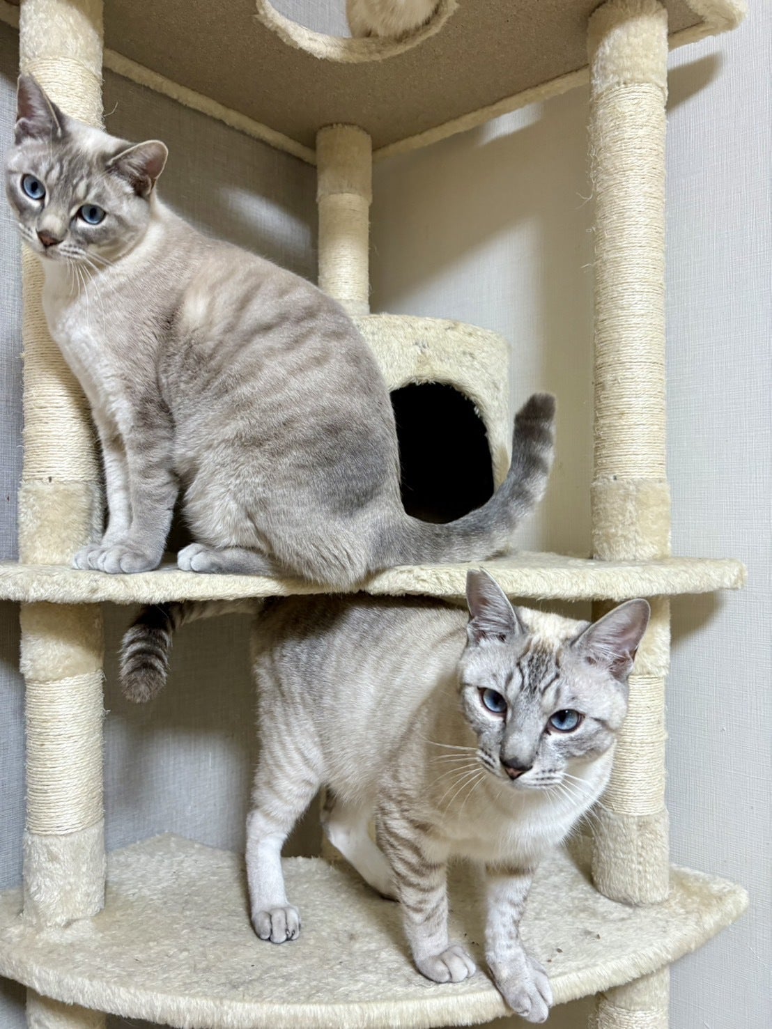 支援で頂いたキャットタワーで遊んいるのは兄弟のソラくん(上段)、レオくん(下段)です。