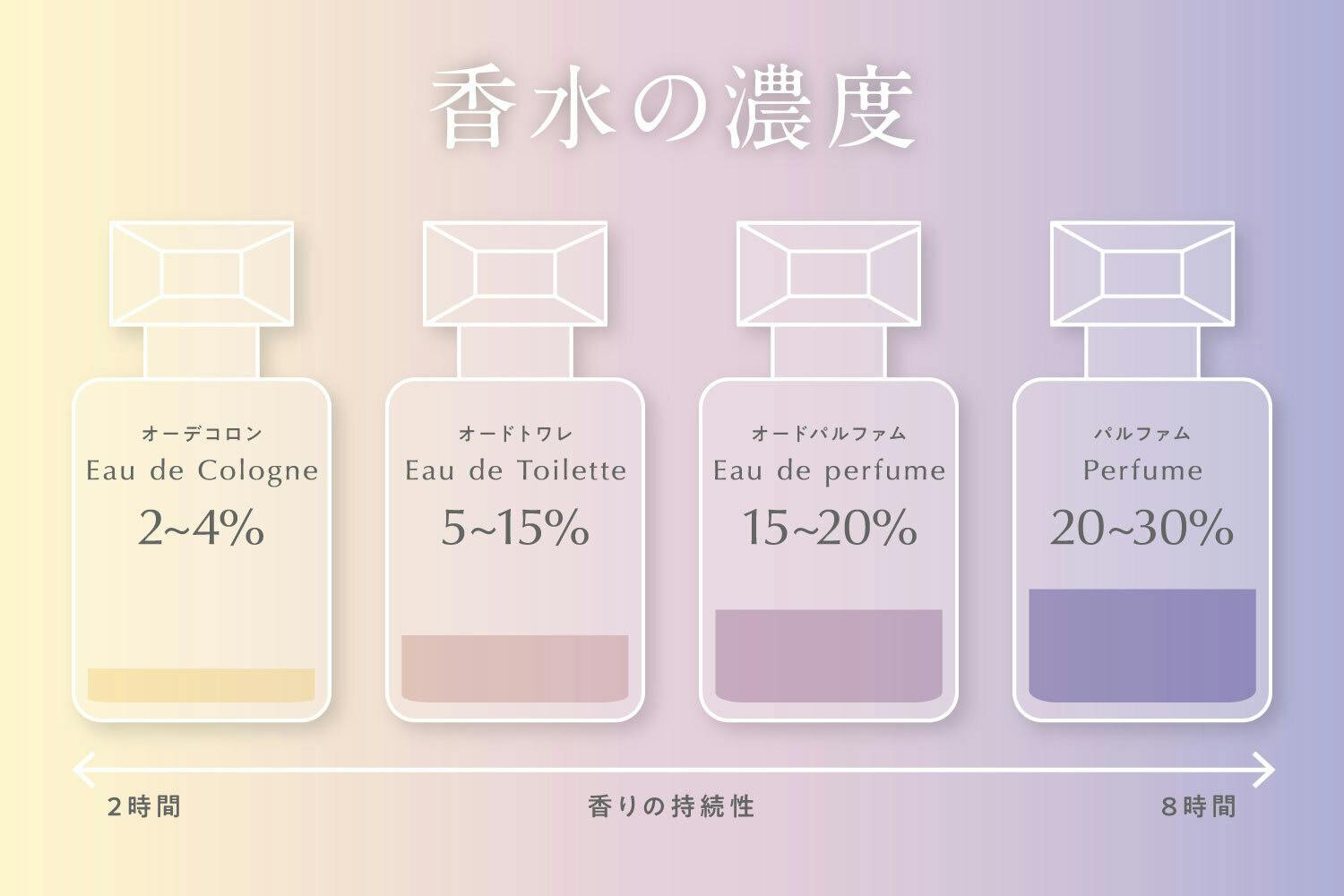 香りを存分に楽しんでいただくために、香料の配合率は15%といたしました。これは市販されている香水の中では中くらいの濃度で、オードトワレ~オードパルファンと同等の持続性のある配合率です。