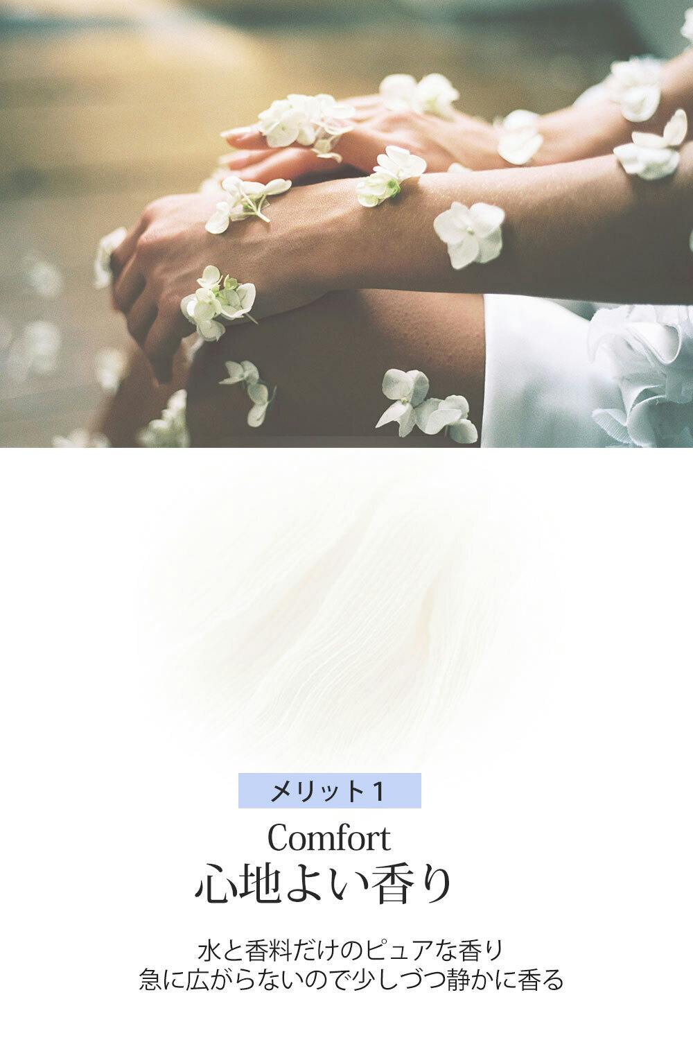 水はアルコールのようなパワフルな拡散性がないため、香りがツンツンしない、優しい印象になります。このため、スプレイしたその瞬間からその香水の本当の良さを感じることができ、ラストノートまで安定した香りが静かに香ります。アルコールの匂いに邪魔されないピュアな香りをお楽しみください。