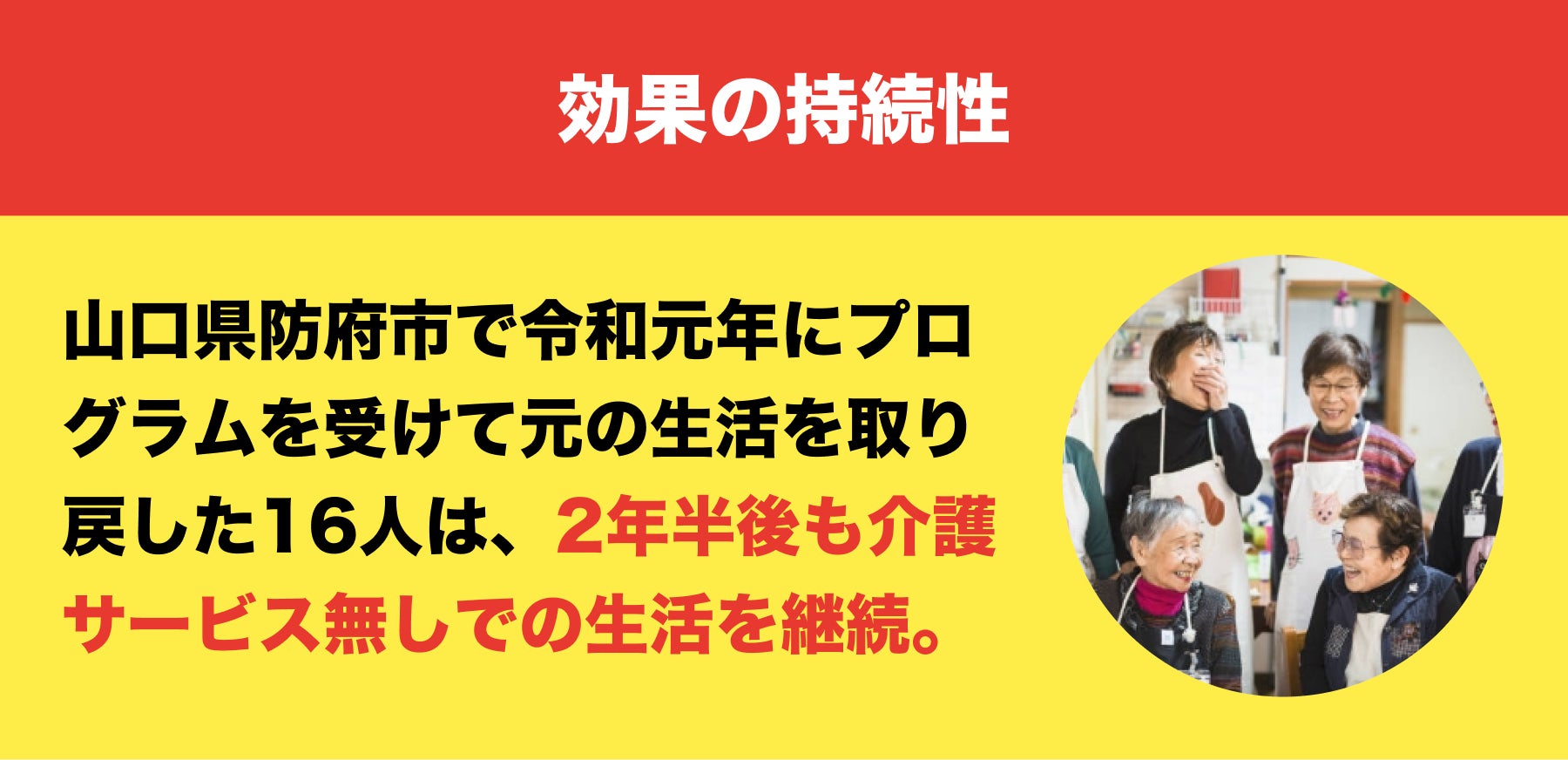 加齢と共にだんだんと出来ないことが増えていき、一度介護サービスを利用すると、サービスを利用し続けなければ生活できなくなる。そんな“常識”を覆し、これまでであれば介護サービスを使って生活をせざるを得なかった状態の方が、元の生活を取り戻している自治体があります。これらの自治体では「リエイブルメント」と呼ばれる介護予防プログラムを提供しており、介護サービスを利用する状態の方の60%以上がプログラム修了後、介護サービス不要の生活に復帰しています。
