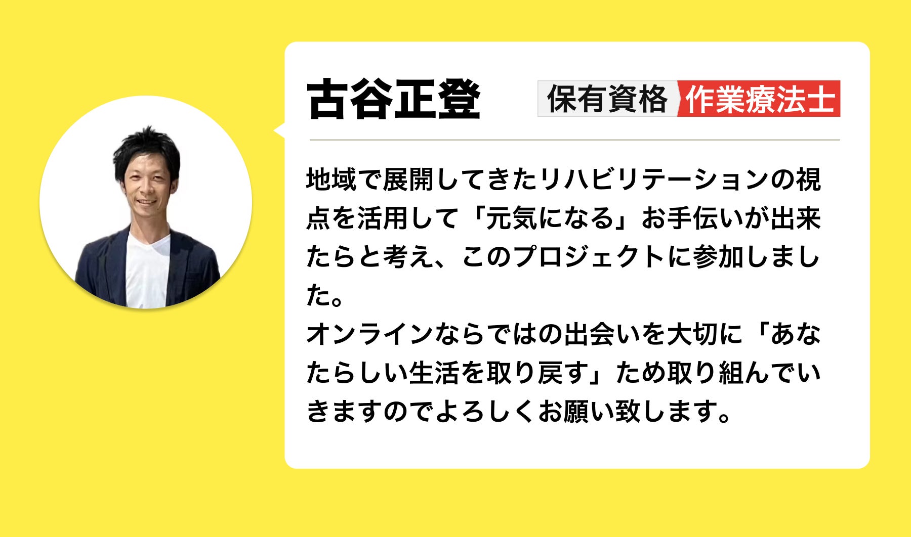 リエイブルメントを利用すれば、介護サービスのいらない生活が出来るかもしれないのに、住んでいる自治体ではチャンスが無い・・・そんな現状を打破するため、我々はリエイブルメントを行っていない自治体にお住まいの方向けに、リエイブルメントをオンラインで提供することに致しました。実際にプログラムを行うのは、山口県防府市で実際にリエイブルメントを提供しているセラピスト(理学療法士・作業療法士)です。また、オンラインでも問題なく効果が得られるか事前にテストを複数人に行い、対面と同等の効果があることを検証致しました。