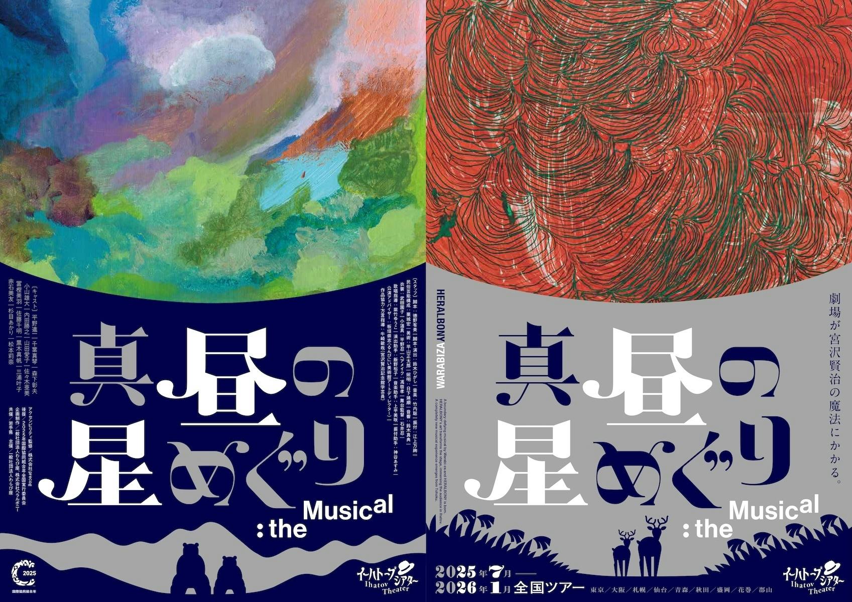 今回のメインビジュアルは表裏2面×2種の計4つ。ヘラルボニー契約作家さんのアートがイーハトーブの世界を彩っています。 これらのアートは舞台にも登場予定ですのでお楽しみに!