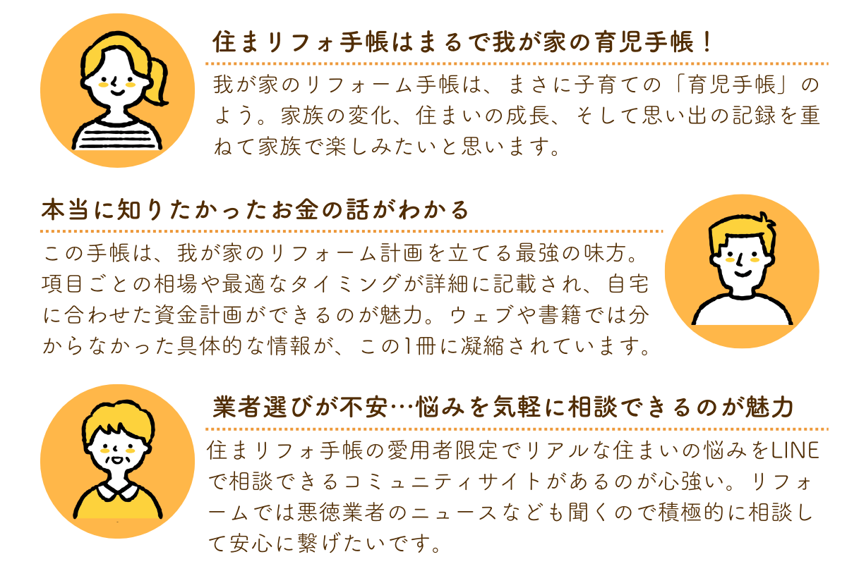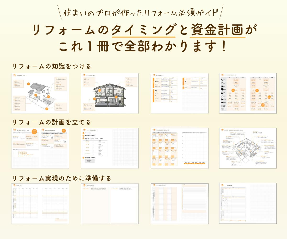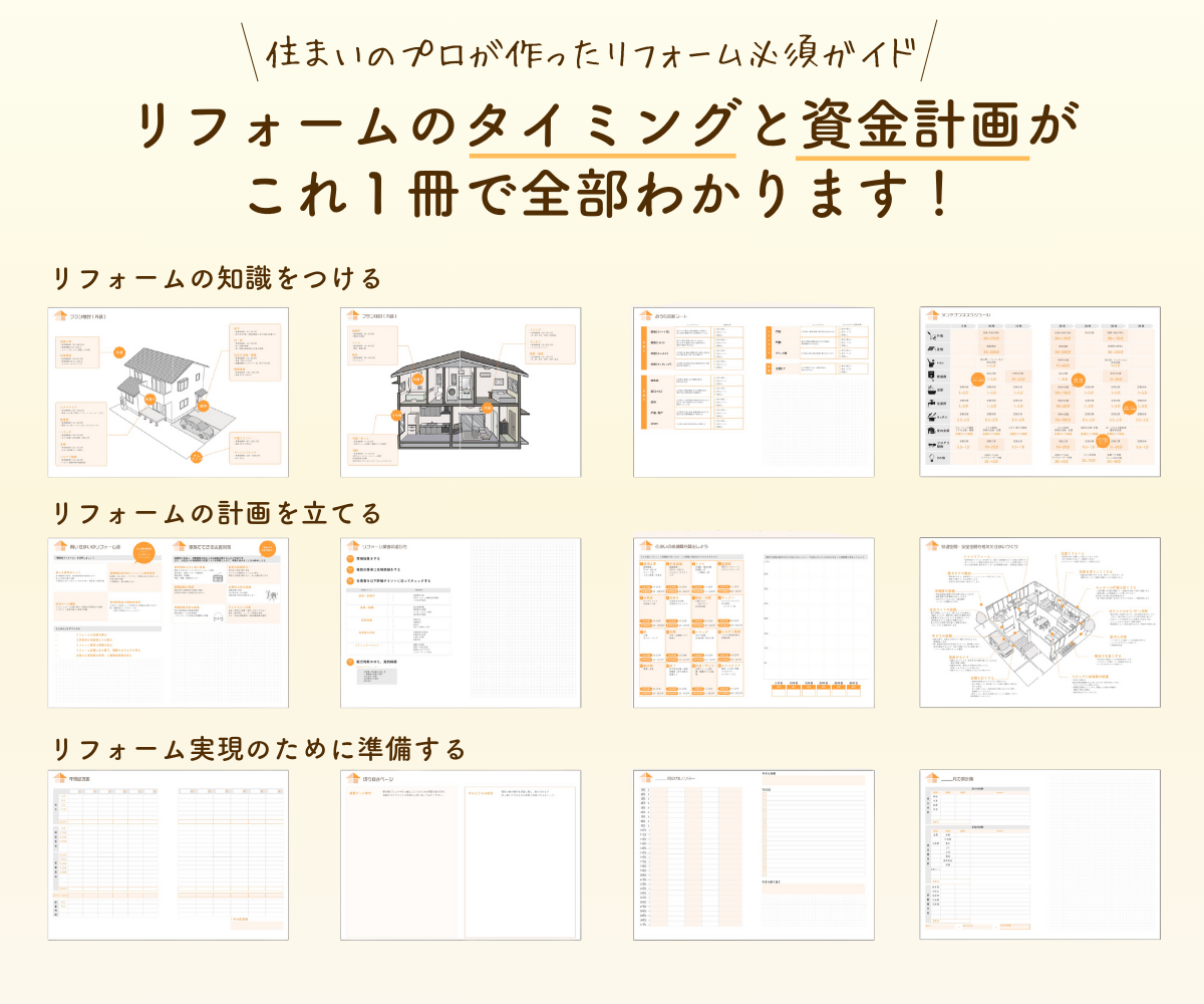 初めてリフォームする人も手帳を手にすることで計画の漏れを防ぎ、理想の住まいの実現に一歩近づけるのではないでしょうか。