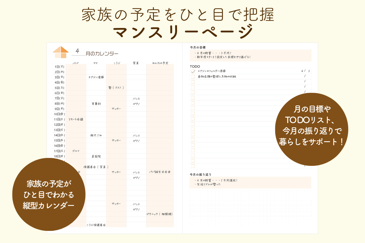 マンスリーページには、家族全員の予定を書き込むスペースを設けています。