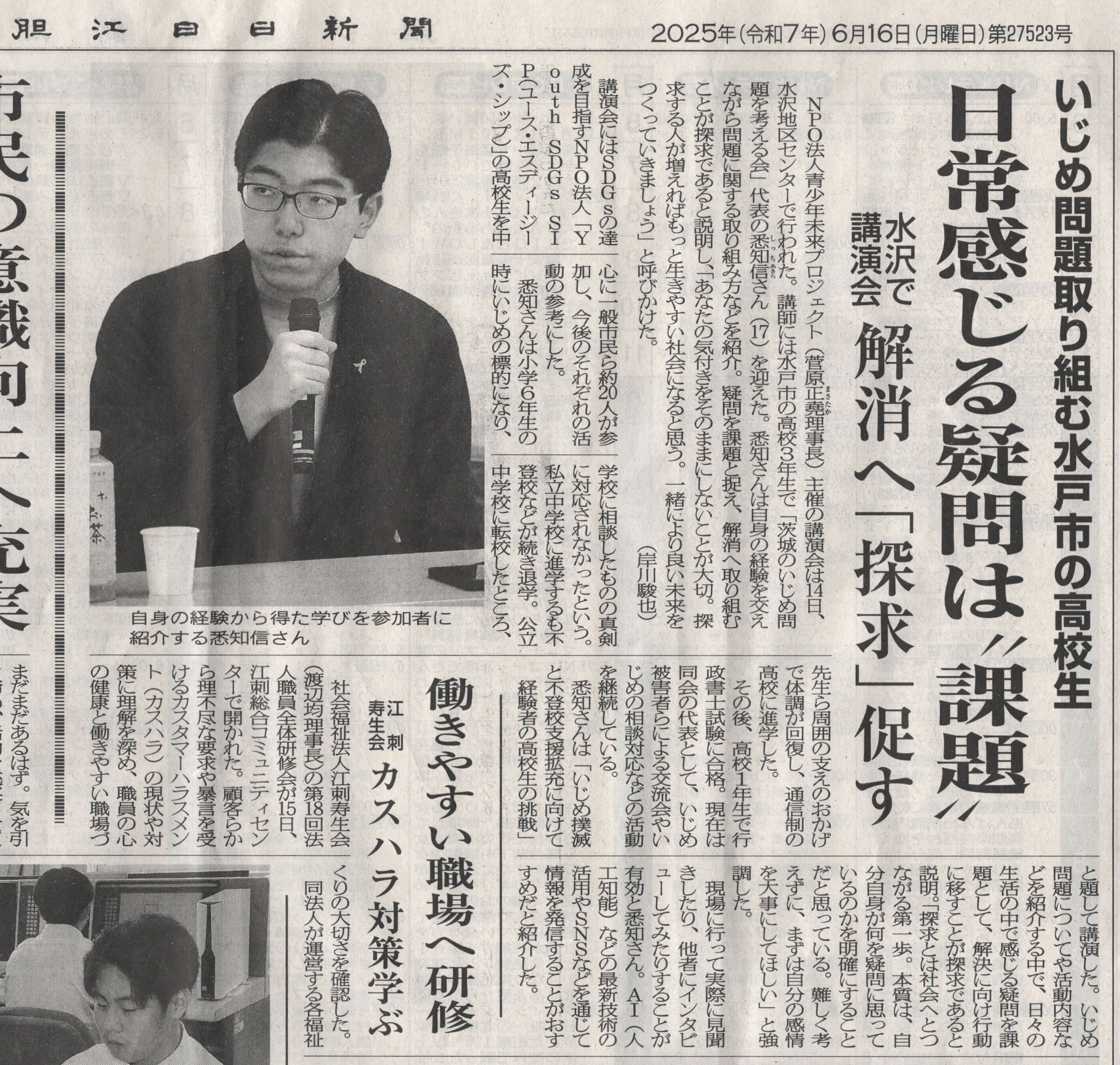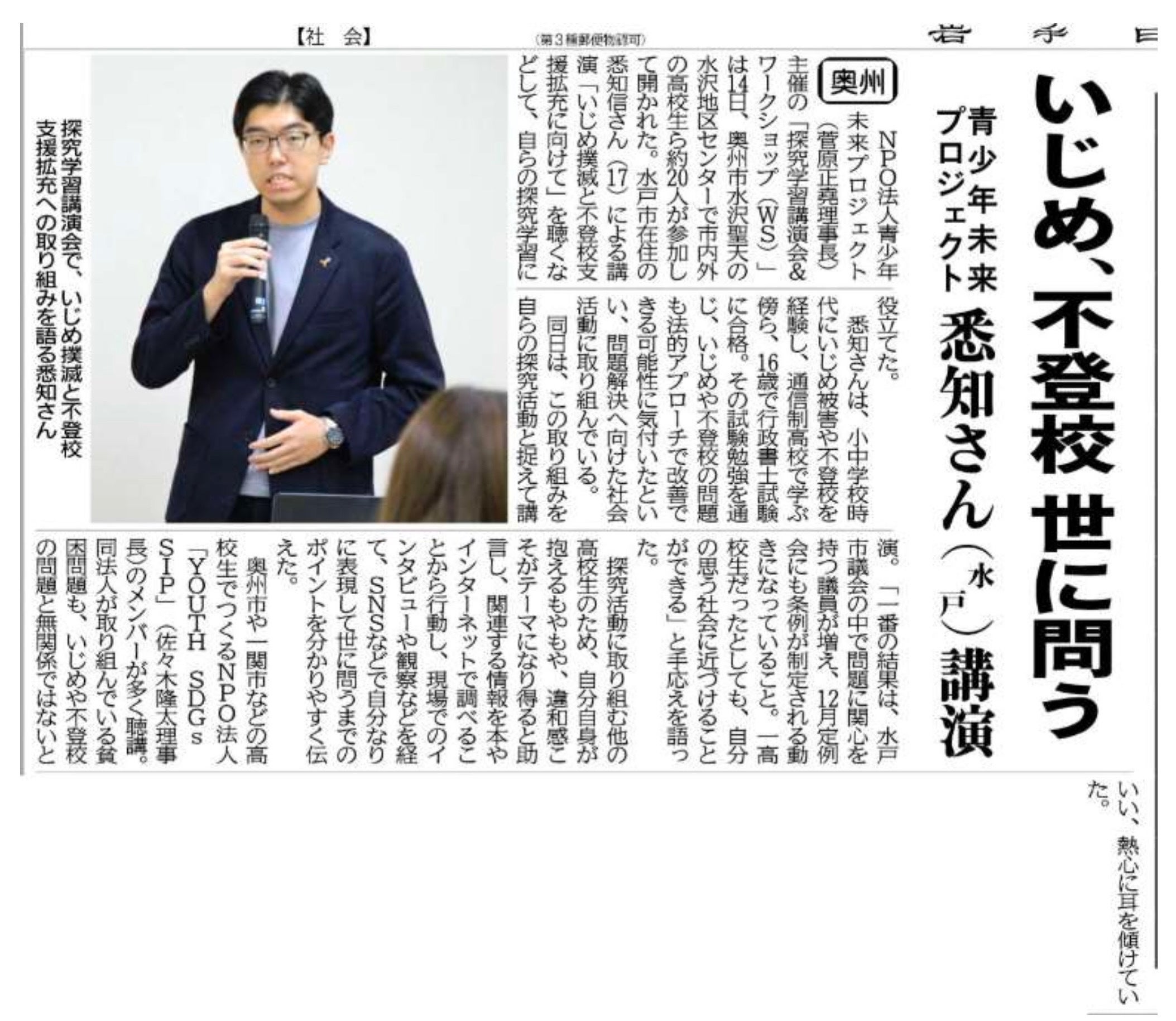 先日の岩手県奥州市での講演が、岩手の地元新聞社「岩手日日新聞」と「胆江日日新聞」に掲載されました。メディアの力もお借りしながら、いじめ問題の改善を進めていきます。