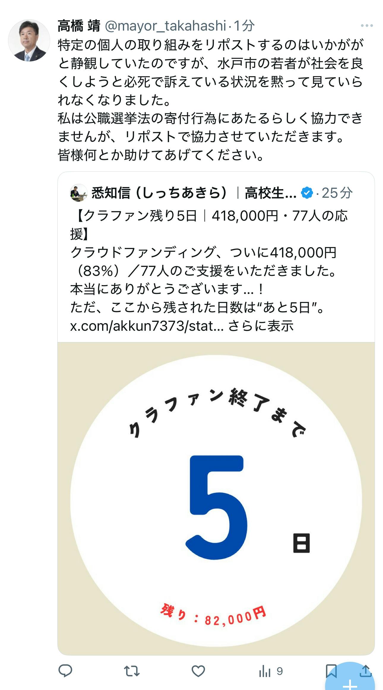 投稿では、「水戸市の若者が社会を良くしようと必死で訴えている状況を黙って見ていられなくなりました。私は公職選挙法の寄付行為にあたるらしく協力できませんが、リポストで協力させていただきます。」との大変心強いお言葉もいただき嬉しく思っています。