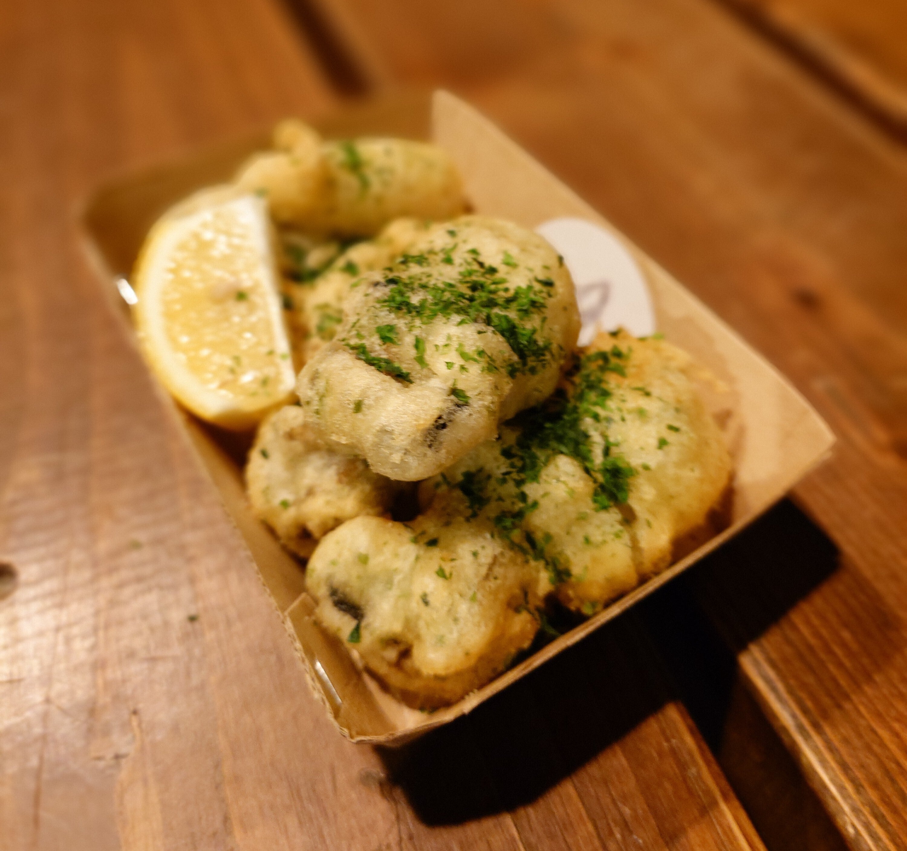 特におすすめはビアフリットと蒸し牡蠣!ビアフリットは衣に水の代わりにビールを使用した洋風天ぷら。