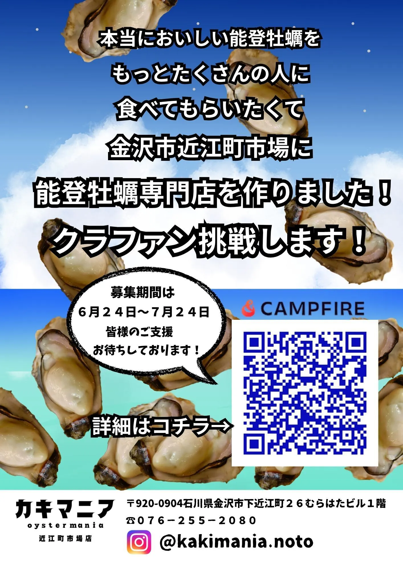 2025/07/10 19:16今回初めてのクラウドファンディングで中間地点を迎えました。まずはご支援いただいた皆様に感謝を申し上げます!現在の目標達成率は21%。後半戦に向けてよりたくさんのご支援いただけるよう中間報告を致します。現在近江町市場は閑散期となっておりお客様がまばらな時期となっております。夏場は主に岩ガキが旬を迎えます、カキマニアでは真牡蠣の旬である5月に大きく育った真牡蠣を生産者さんに協力していただき近江町市場の冷凍倉庫に大量ストックしました。これにより一年を通しておいしい能登牡蠣を楽しんでいただけるようになりました。この時期の一番人気の牡蠣メニューは『蒸し牡蠣』。ぷりぷりでおかわり続出中です。「能登に行かなくても、本当に美味しい牡蠣を届けたい」という想いを胸に、今度は皆さまの力を借りて、牡蠣食文化をもっと未来へつなげる場所を作りたいと思っています。応援よろしくお願いいたします!!カキマニア石原 もっと見る