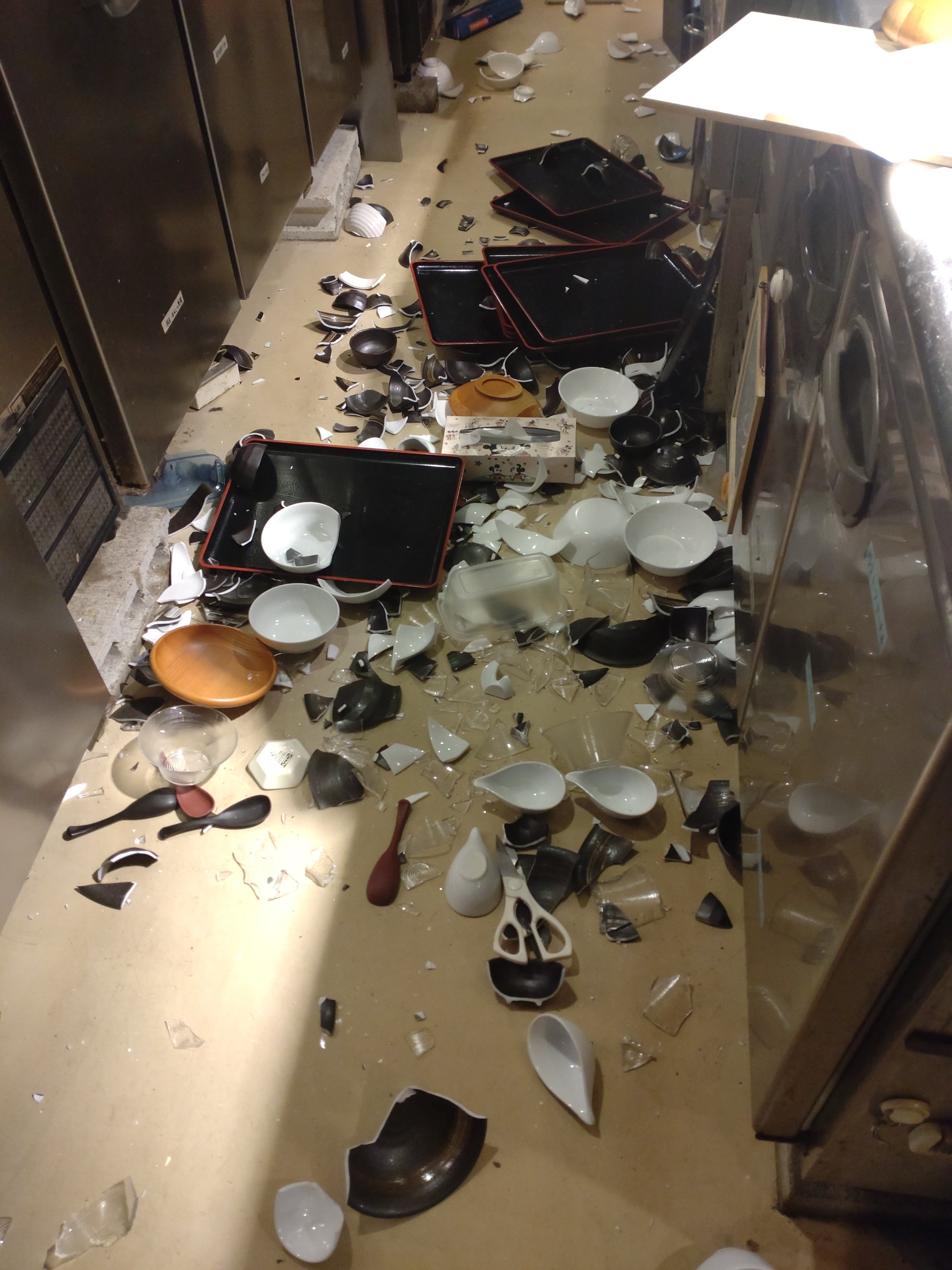 幸い人的被害は免れましたがほとんどの皿や丼、酒の瓶などが割れ足の踏み場もない状態になりました。