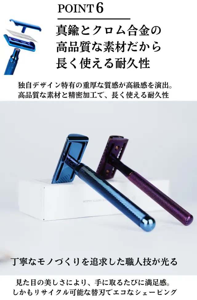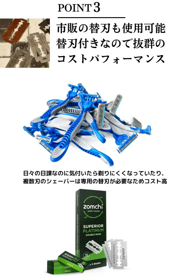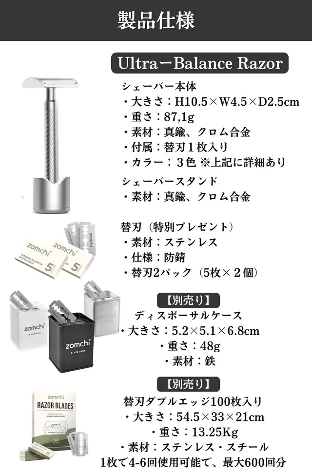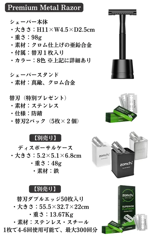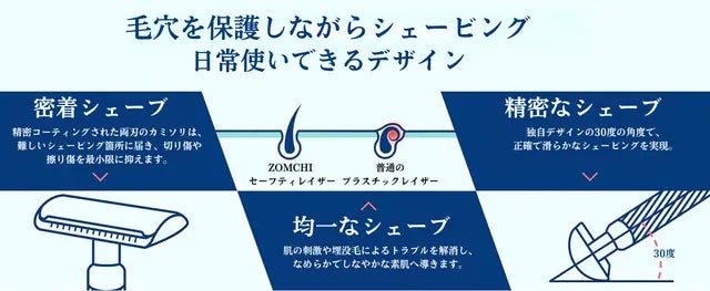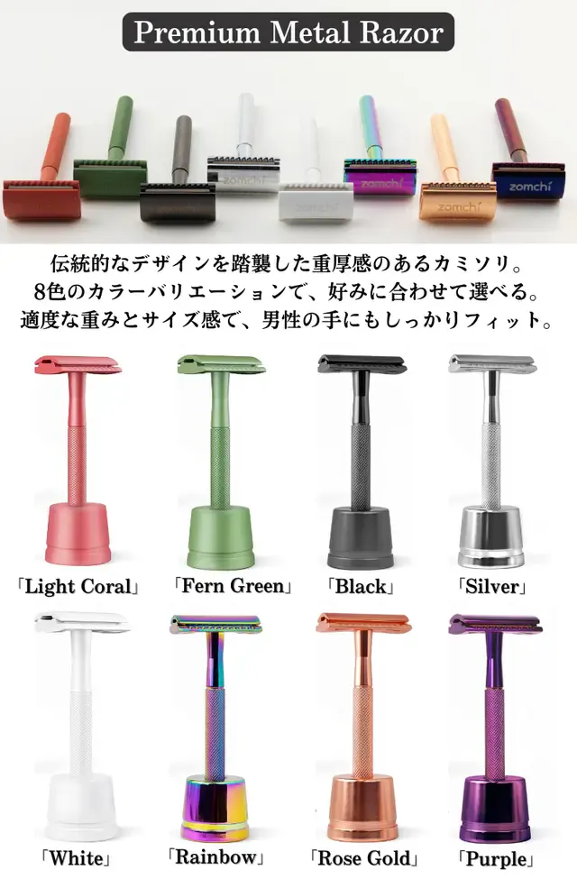 ZOMCHI RAZORは、使い捨て文化を見直し、地球と肌に優しいシェービングを提案するブランドです。伝統的な両刃カミソリのスタイルを現代に復刻させ、環境負荷を減らしつつ、肌に優しい剃り心地と使いやすさにこだわった製品を開発しています。