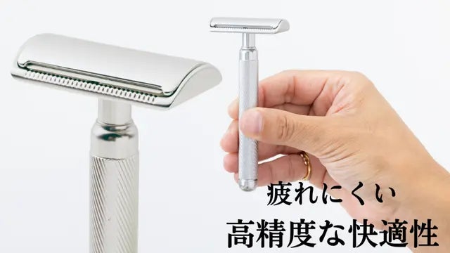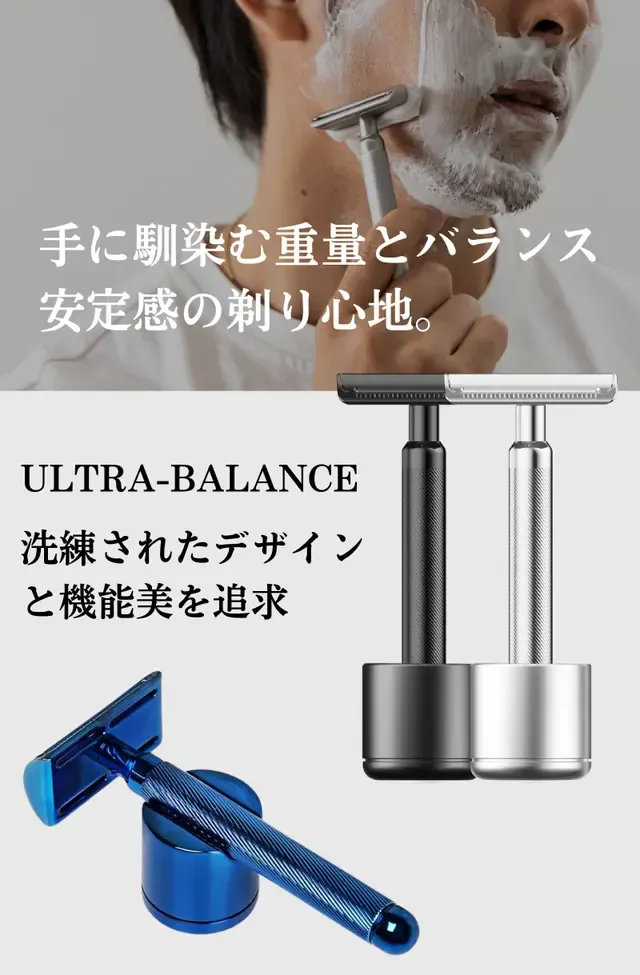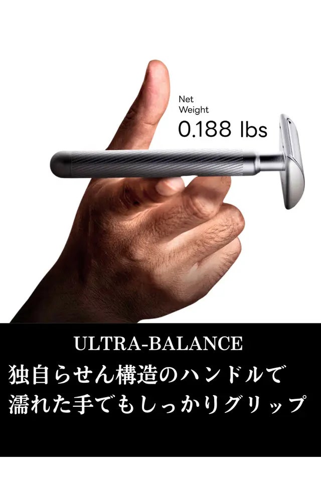 Ultra-Balance Razorは、87.1gとより軽量で、真鍮とクロム合金の素材を使用しています。 らせん状の溝により、濡れた手でもグリップが良好です。刃の間隔は0.70mmで、軽量であるため精密なコントロールがしやすく、女性の顔の産毛や敏感肌にも優しく剃ることができます。スムーズなタッチで肌への負担を軽減したい方に適しています。