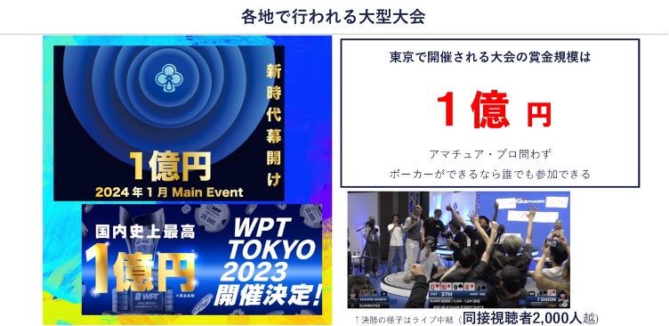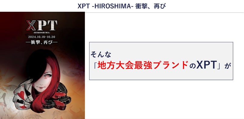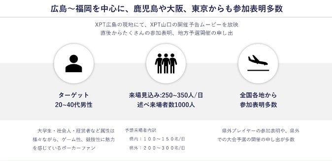 「XPT大会」は、広島県をはじめ、全国各地で開催され、全国から多くのポーカープレイヤーやディーラーが山口県に数多く訪れ、メディアにも注目されており、地域活性化の可能性を秘めた大きなインパクトをもたらすことができる大会です。