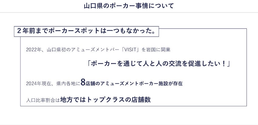 今回、エンターテイメントを通じて地域を元気にしたいという熱い想いを持つ近石雄太さんを応援するため、このプロジェクトを立ち上げました。近石さんは、自衛隊から転身し、アミューズメントポーカーという新たな文化を山口県に根付かせようと尽力されています。