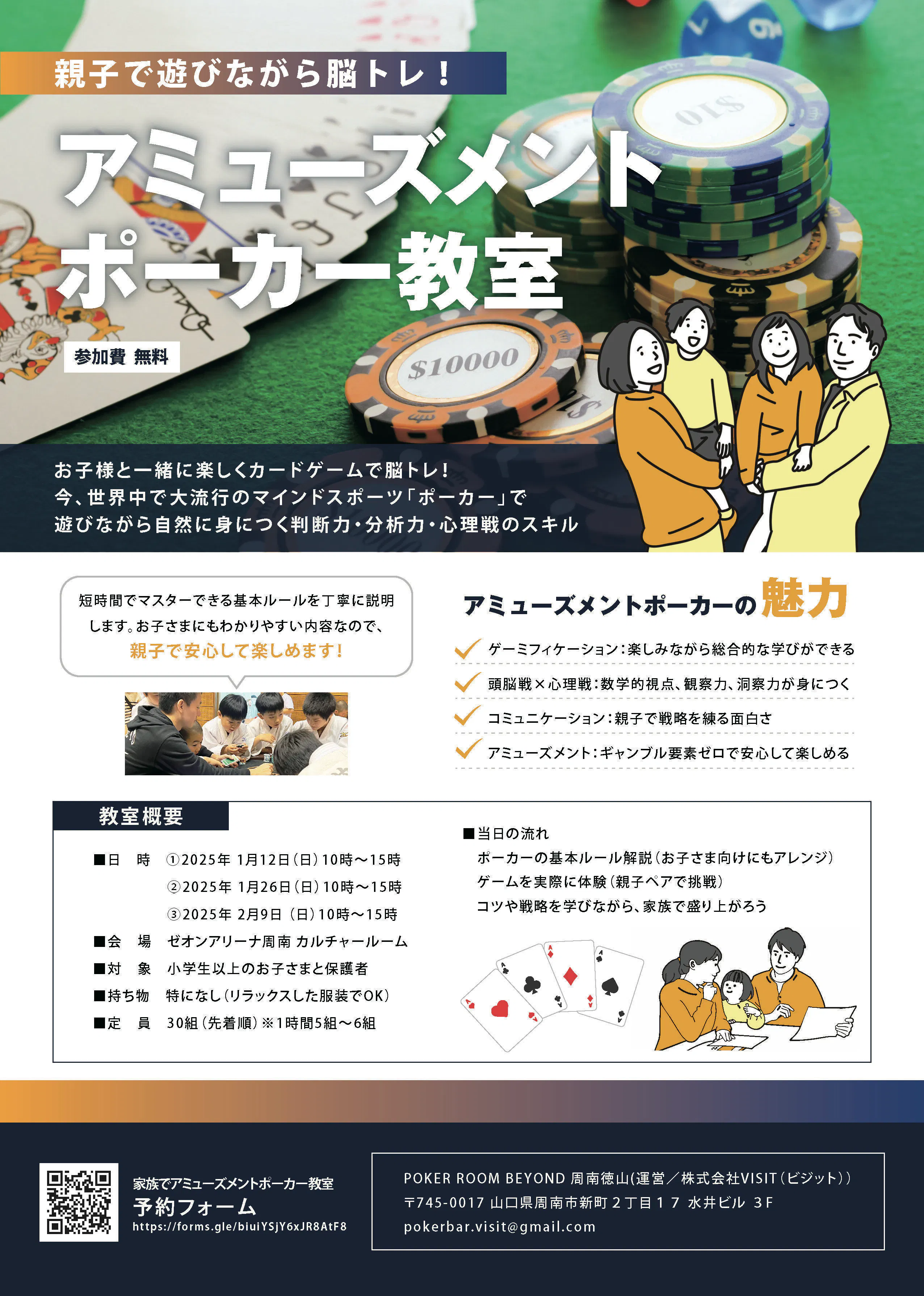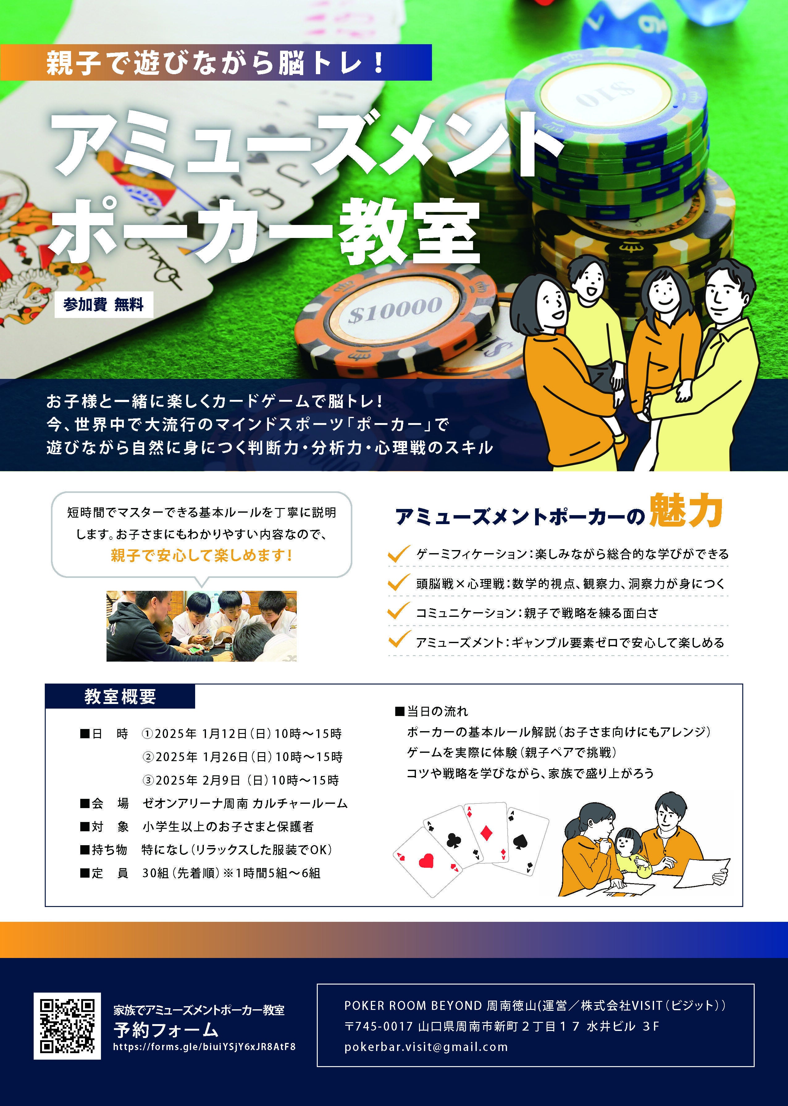 2025/02/09 11:23 山口県や広島県で大人気の子どものための冒険遊び場プレーパーク[ハダシランド]さんで親子で一緒に楽しめる初心者向けポーカー体験を毎月無料で開催しています![ポーカーの魅力って]頭脳戦×心理戦:親子で協力して戦略を練る面白さ!コミュニケーション:家族で会話しながら楽しめる!成長につながる:お子さまの考える力や決断力も育まれる!などお子様にとって脳トレだったり、親御さんにとっては新しい趣味やコミュニケーションツールになったりと大きな可能性を秘めていると思って、ゼオンアリーナ周南という体育館でスポーツの試合をしに来ているお子様や観覧に来ている親御さん達とポーカーを一緒に楽しんでます。XPT山口大会もいよいよ14日〜から開幕!2月の15・16日は、徳山駅隣接の複合施設[TOKUYAMADECK]にて大会と合わせたサイドイベントも開催する予定です!XPT大会を通じて周南市が盛り上がったら嬉しいな!またご案内しますね。お楽しみに! もっと見る