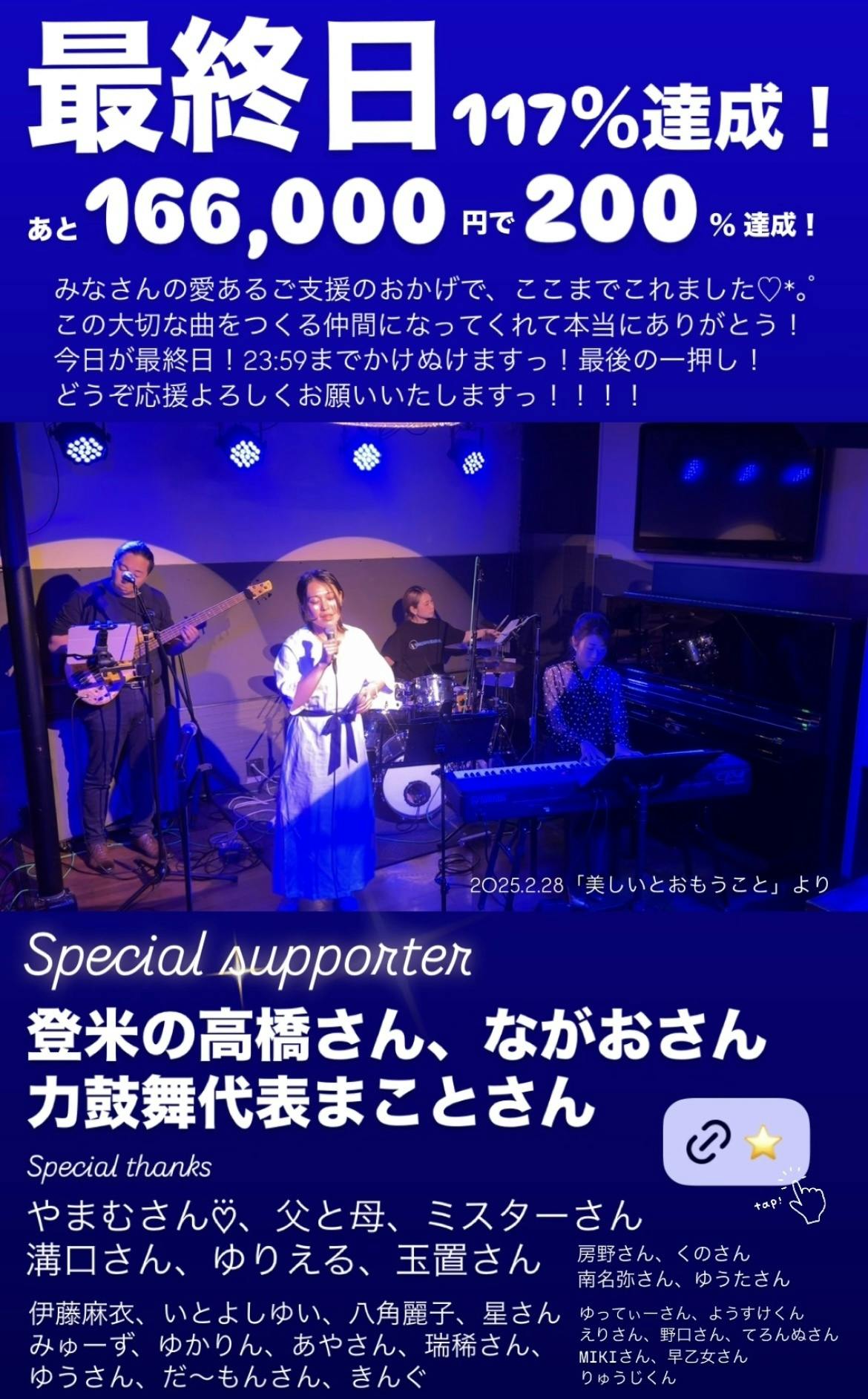2025/03/25 09:00あと【3日】となりました!100%まではあと少し!!!この記事を書いている今現在、79%で158,000円のご支援を25名の支援者さまからいただいています!!!愛のあるご支援、ほんとうにありがとうございます!!!複数回にわたり、支援してくれる方も!そして!30,000円以上のSpecial supporterさまも、今のところ2名いらっしゃって、ほんとうに感謝しかないです!!!今回わたしが個人的に受け取ってほしいなと思うのは【歌詞カード】のリターンなんです!!みなさんが思う歌詞カードよりも数段スペシャルな感じに仕上がるんじゃないかな〜と思っています♪残り3日で100%まではあと【42,000円】200%のミュージックビデオ制作までは【242,000円】です!!!このプロジェクトをSNSなどで拡散していただけると嬉しいです!追加のご支援もほんとうにありがとうございます!!!最後の1秒まで駆け抜けます!引き続き、応援よろしくお願いします!! もっと見る