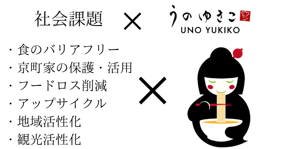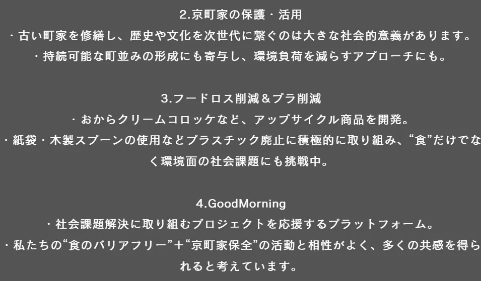 - 私たちは京町家と新しい食文化と組み合わせることで、歴史的建造物を次世代へ継承したいと考えています。