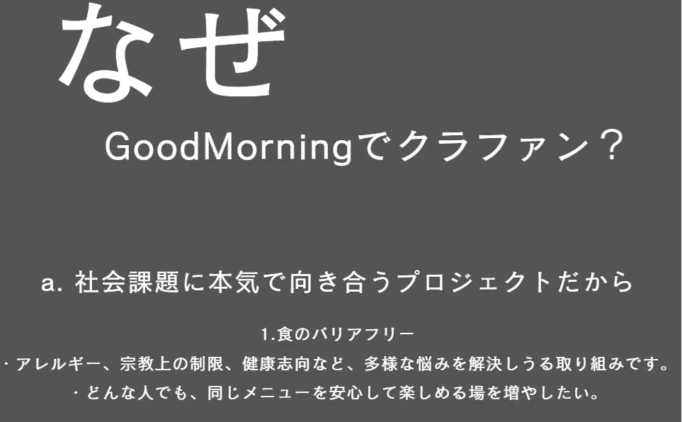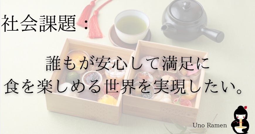 - しかし、外食産業の大半はまだ「全員が安心して満足に食を楽しめる」レベルに届いていません。アレルギー対応の別メニューを仕方なく選ぶ、一見入ってなさそうなメニューに実は入っている。あるいは外食自体を諦める方々が存在します。