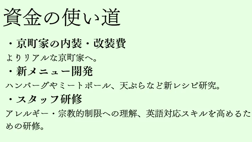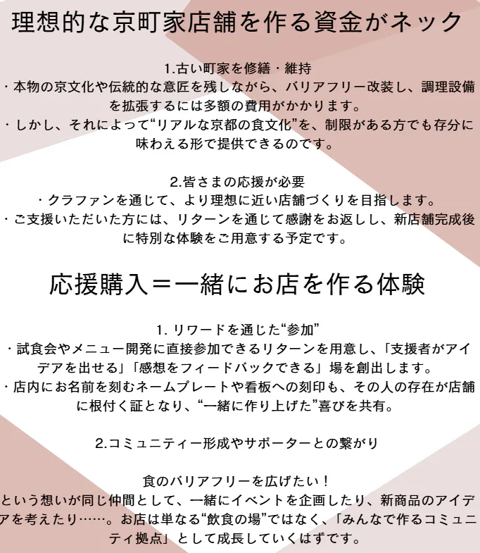 京都ならではの町家空間で、よりリアルに本物の食文化を感じてもらうーーしかし、この新店舗の立ち上げには相応の資金が必要。そこで、社会課題解決型クラウドファンディング「GoodMorning」にて、皆さまからのご支援をお願いしたいと思います。
