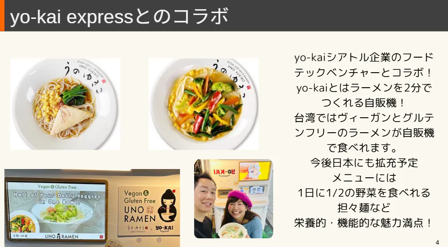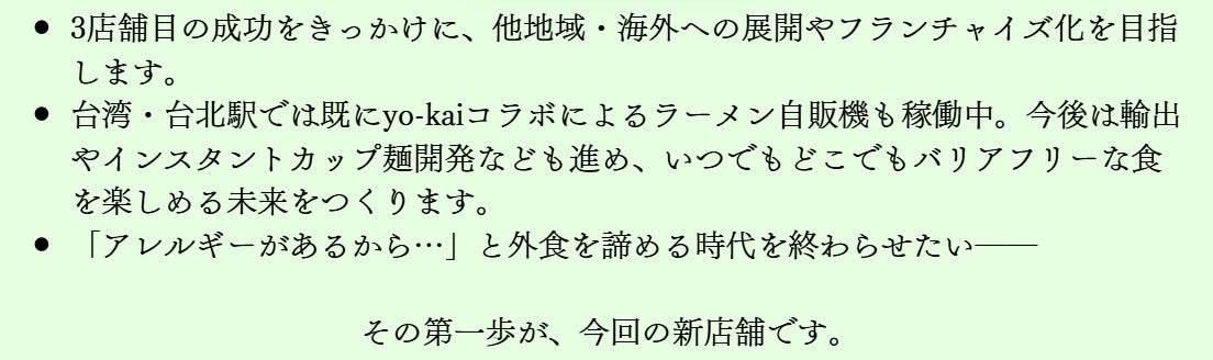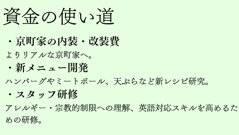 - 「ラーメン・寿司・居酒屋・アフタヌーンティー」を一度に楽しめる店を、京町家でオープン予定。カレーやハンバーグ、ミートボール、天ぷらなど、新メニューを多数開発し、より多くの人のニーズに応えたいと考えています。京町家の庭や灯篭、すりガラス、井戸の名残を活かしつつ、海外の方にもわかりやすい英語・ピクトグラム対応で、真のフードバリアフリーを実現!